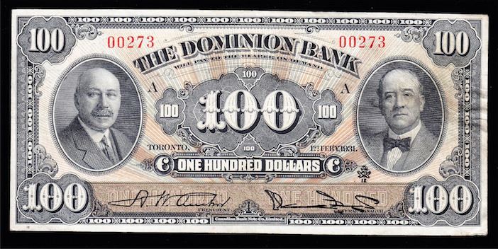 Dominion Bank $100, 1931 - Trophy Note - CH 220-24-14. EF. The finest example available. Charlton states "The $100 is quite rare with only seven notes recorded (one institutional)". This example is much better than the Thomas Flynn example that fetched approx $10k in 2011. S/N:00273/A.
