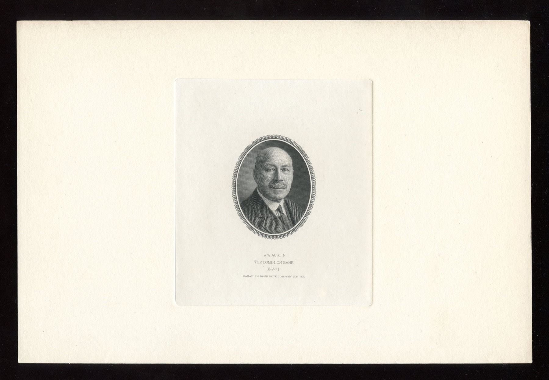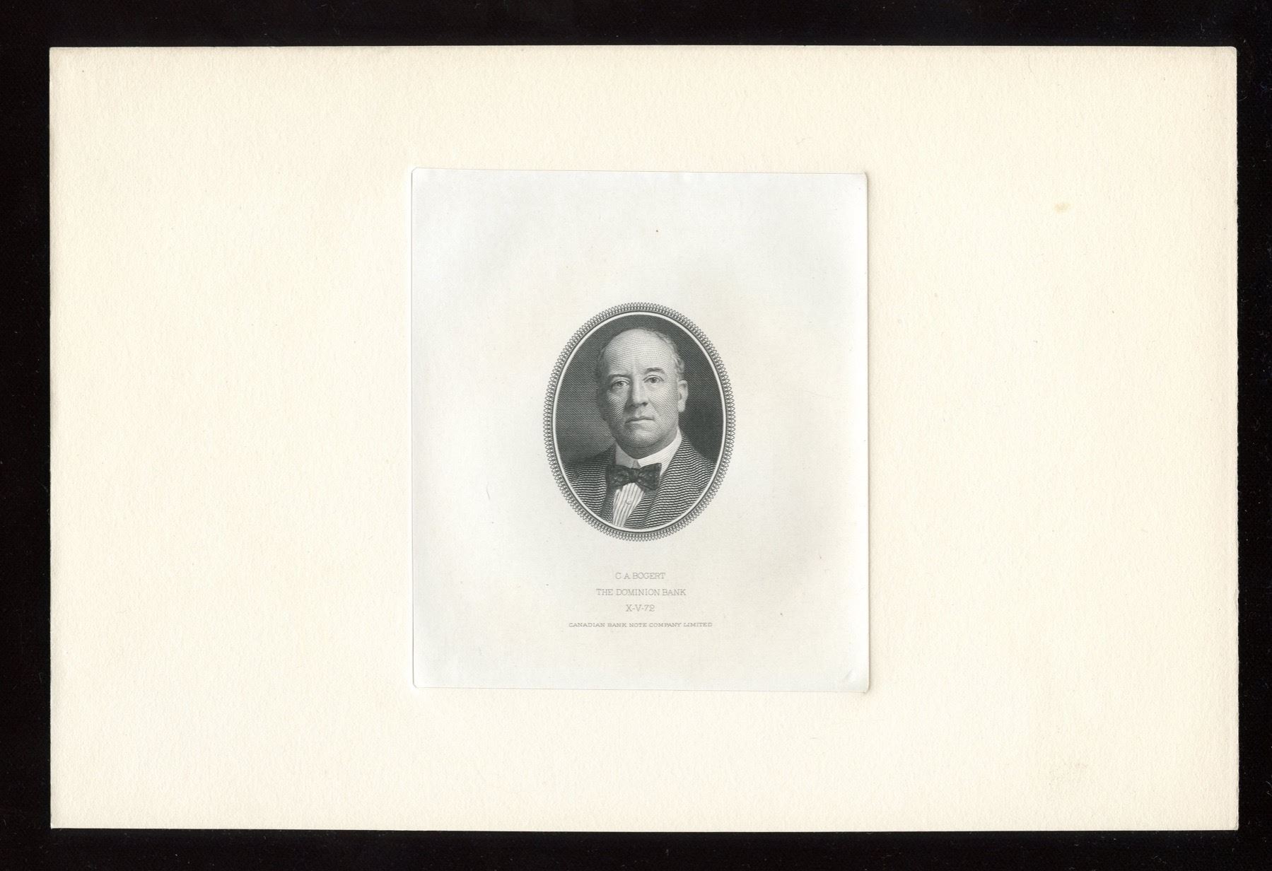 A. W. Austin, CBN X-V-71, and C. A. Bogert, CBN X-V-72.  Both are mounted on 6 x 9 inch cards.  Lot also includes the source photograph used for Mr. Bogert's portrait, reduced to the same size as it appears on the notes.  The back of the photograph bears the name of engraver E. Loizeaux, and the order number, O-724, in pencil.  Three items which would enhance a display.