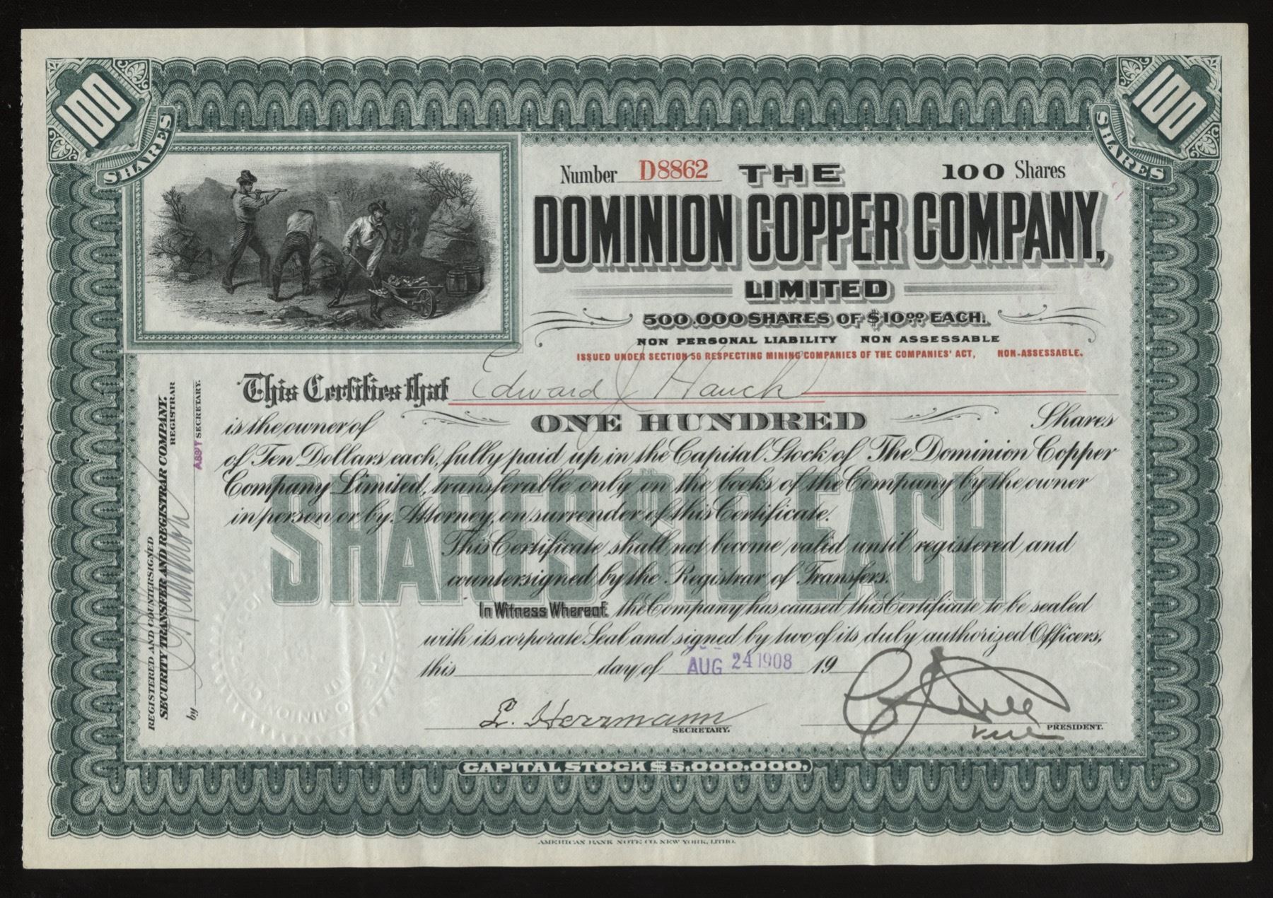 100 shares Green 1908 D8862 Miners at top left. Very attractive British Columbia mining certificate, EF.
