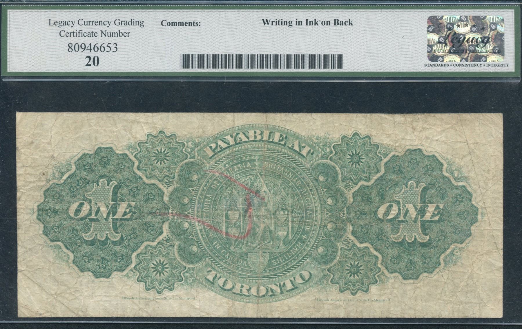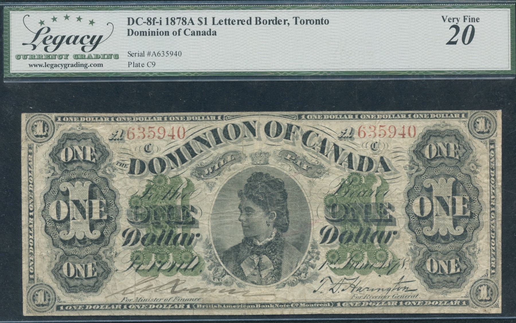 DC-8f-i. Legacy Very Fine 20, writing in ink on back. A Series, Toronto variety. S/N:A635940.
