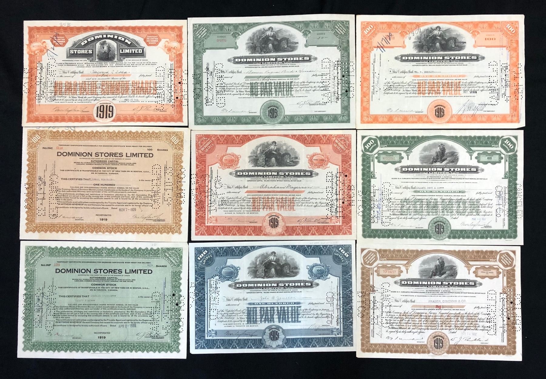 Dominion Stores, collection of Share Certificates. Lot consists of sixteen colourful certificates, of which nine are different. All but three have vignettes. Issue dates are in the 1925-1939 range, printed by BABN.