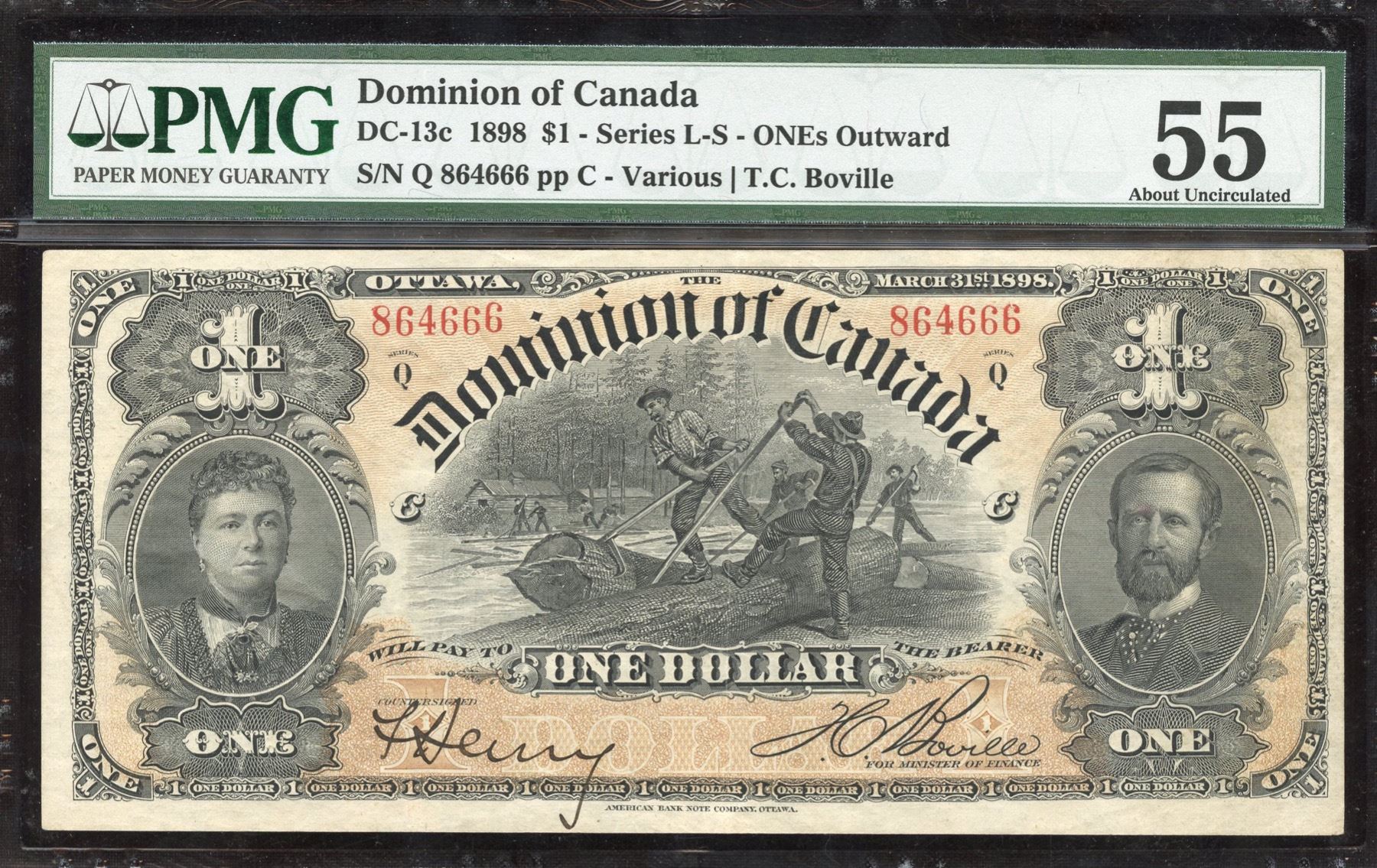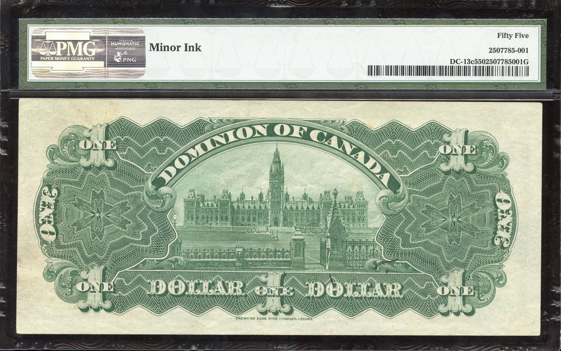 DC-13c. Series Q, graded by PMG AU-55. There is a comment on the back of the holder, “Minor Ink”, but this was most likely caused by the wet ink transfer of the manuscript signature from the note on the sheet below. Nice original paper abounds on this note, along with nice margins and a bold manuscript left signature. Just one minor centre fold. Only 6 notes graded finer by PMG. A lovely note. S/N864666.