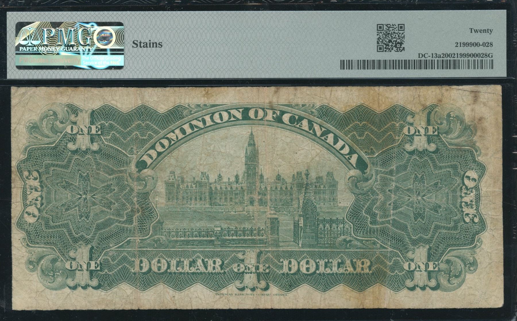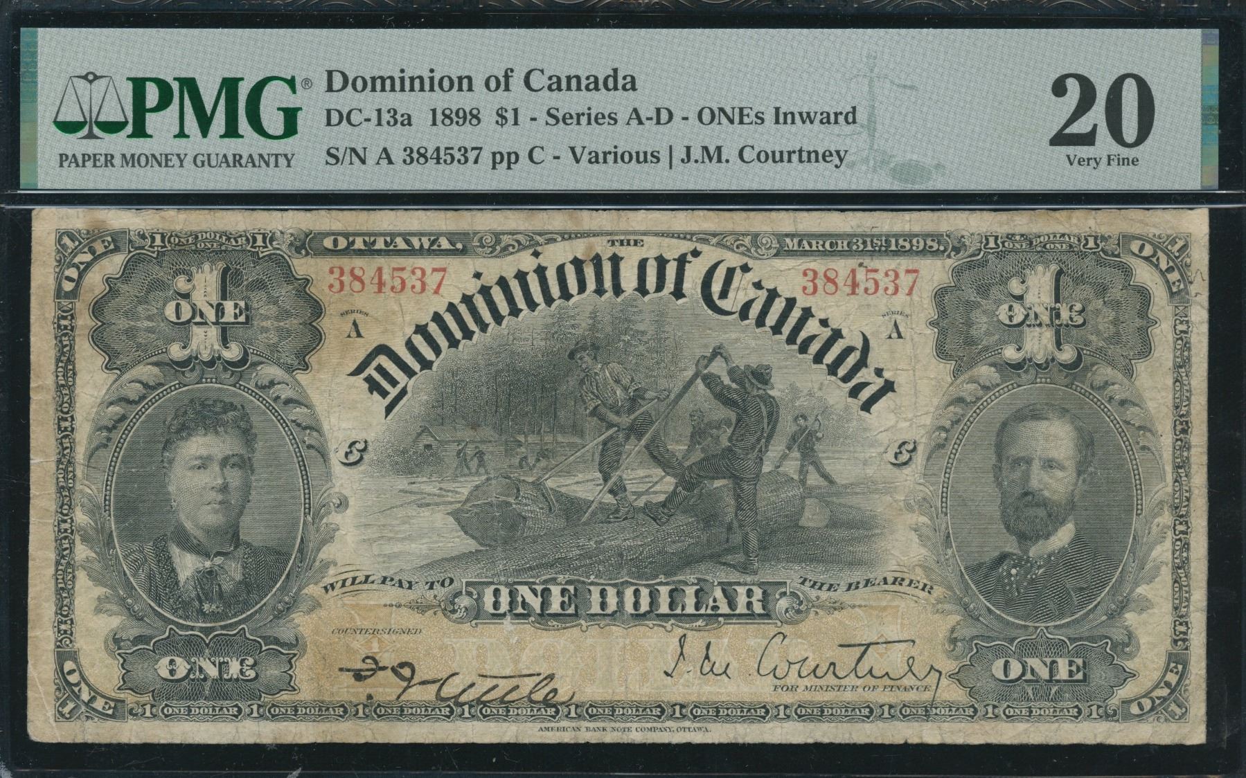 DC-13a. PMG VF 20, stains. Inward One's, Series A. S/N:384537/C.