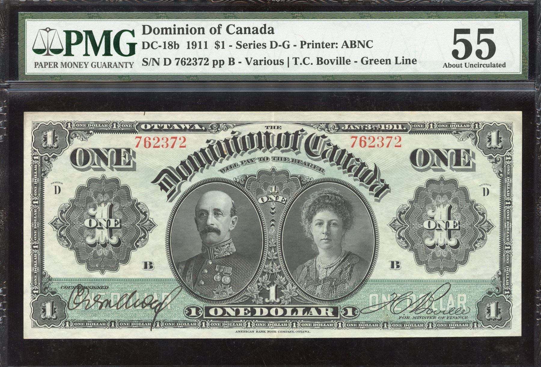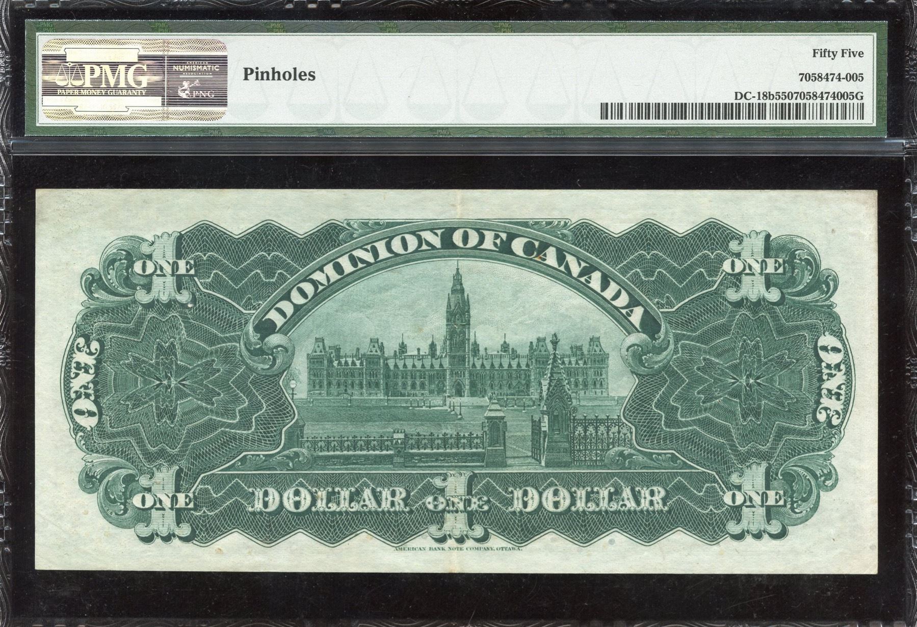 DC-18b. Green Line, Series D, graded AU-55 by PMG. There are two almost imperceptible pinholes, in the left “1” counter, resulting in the comment on the back of the holder. Otherwise, the note has fully original paper, nicely margined, with full embossing.