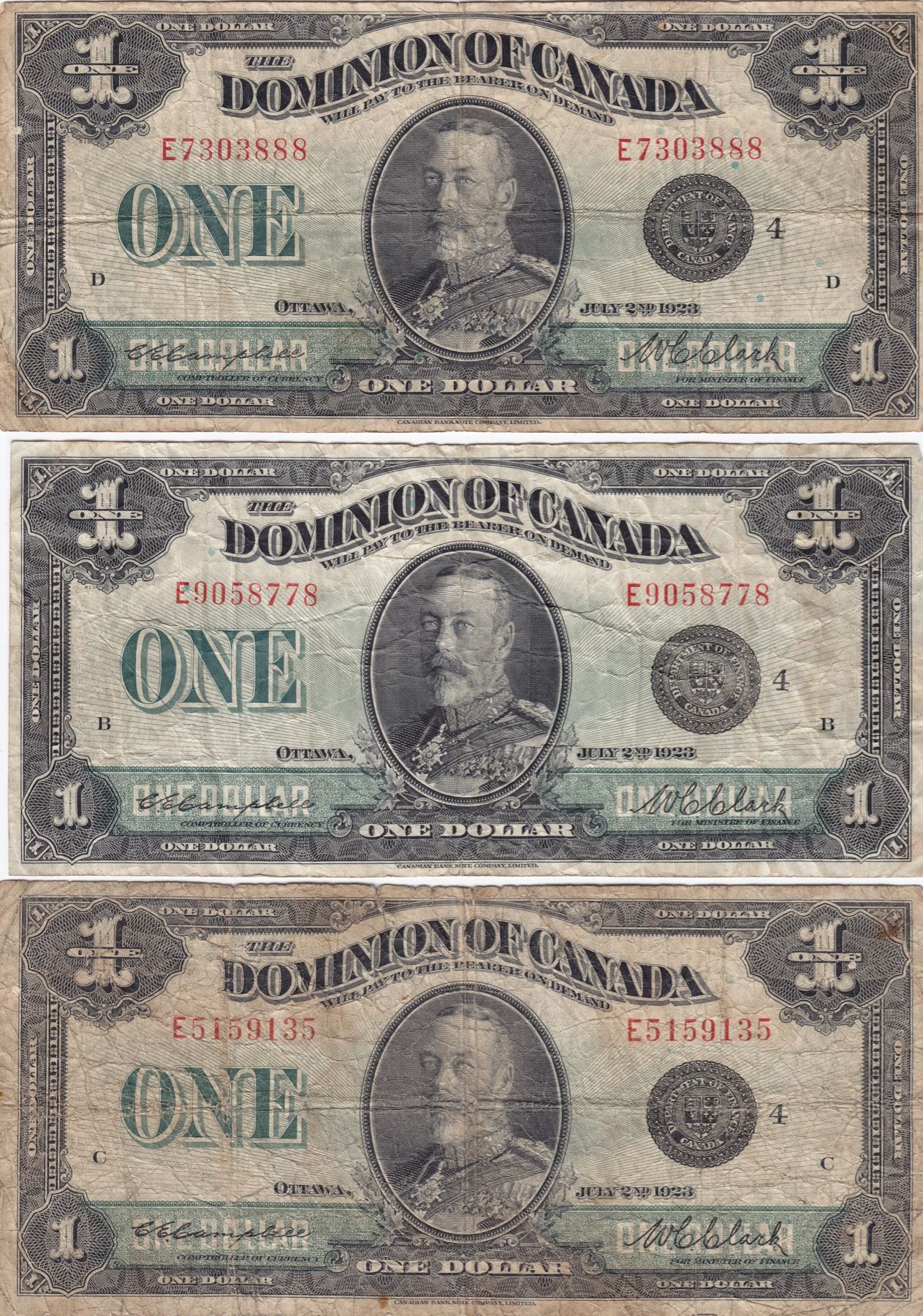 DC-25o. Campbell-Clark, Black Seal, Group 4. E5159135, E7303888, E9058778. Notes are VG/F. 3 Pcs.