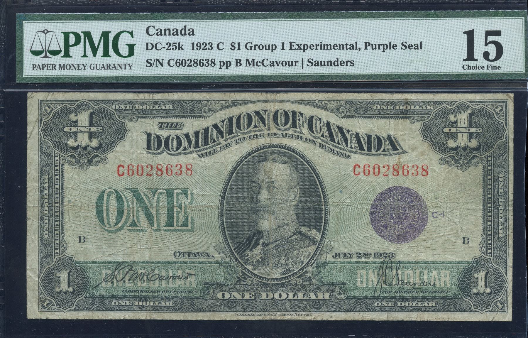 DC-25k. PMG choice Fine 15, holder is cut open at right. Experimental purple seal. S/N:C6028639/B.