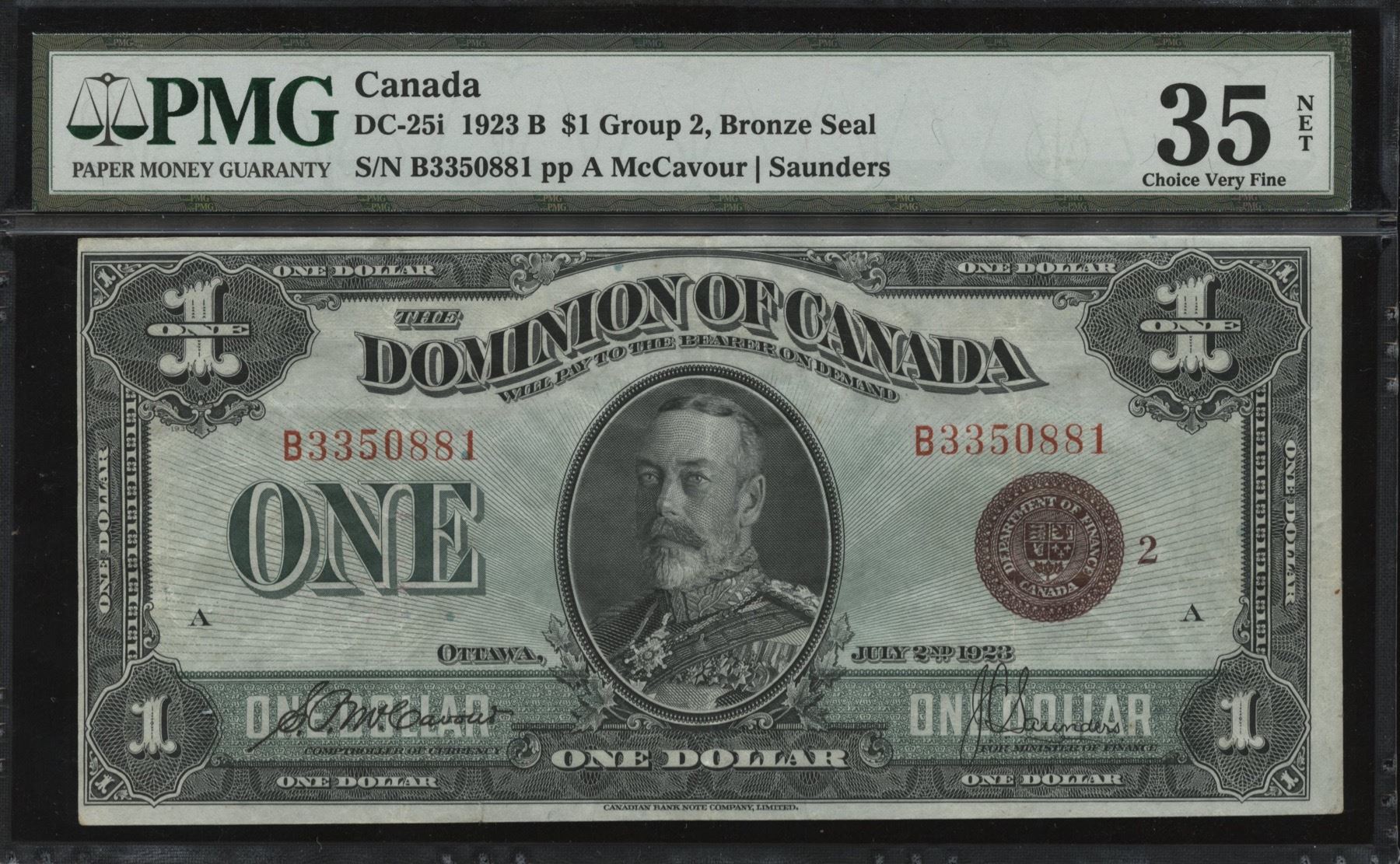 DC-25i. PMG VF35, tear repair. Bronze Seal, Group 2, Series B. S/N: B3350881/A.