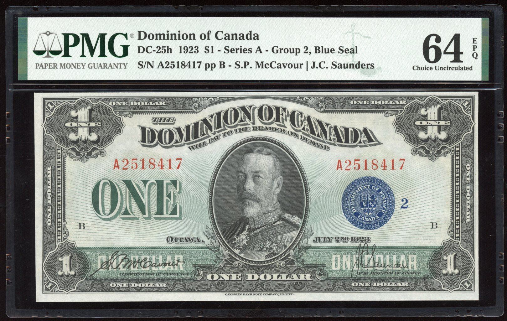 DC-25h, blue seal, group 2. PMG Choice Unc. 64EPQ. S/N: A2518417/B.