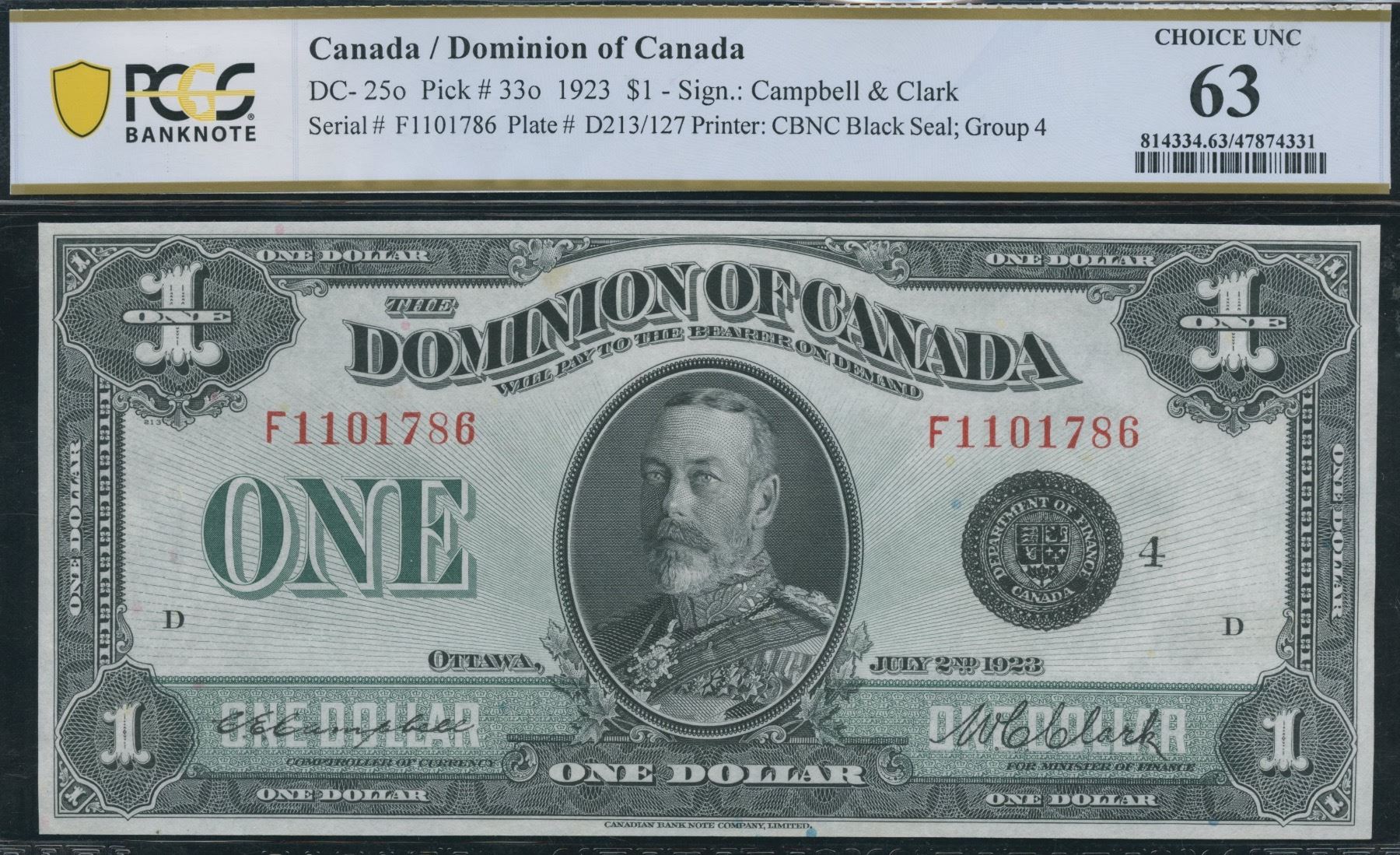 DC-25o. PCGS Choice Unc 63. Campbell-Clark, Black Seal, Group 4. S/N: F1101786/D.