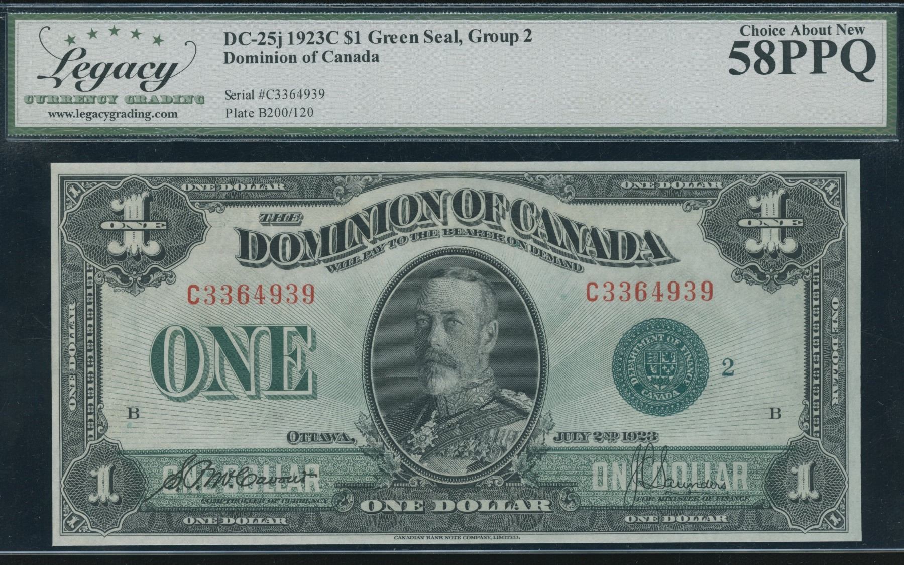 DC-25j. PMG Choice AU58PPQ. Green Seal, Group 2. S/N:C3364939/B.