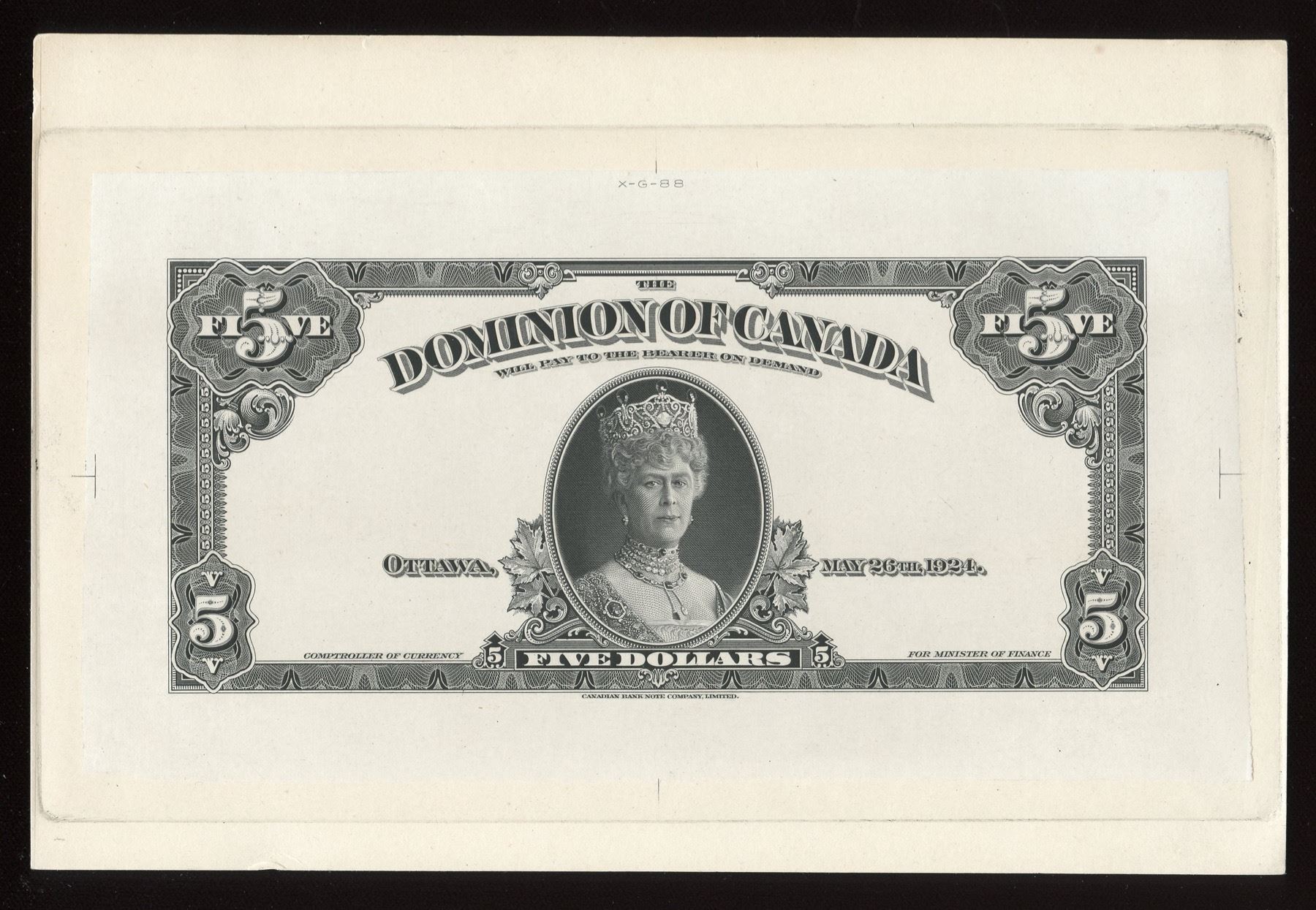 Dominion of Canada, DC-27FP, 1924 $5 B&W Face die proof (precursor to plate proof) with extra wide margins, mounted on card.