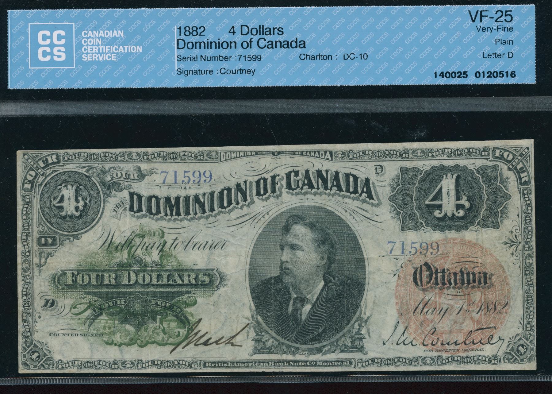DC-10. CCCS Very Fine 25. A bright and attractive example rarely offered in any condition. Two examples in Legacy and BCS holders have sold for $19,552 and $27,600. S/N: 71599/D.
