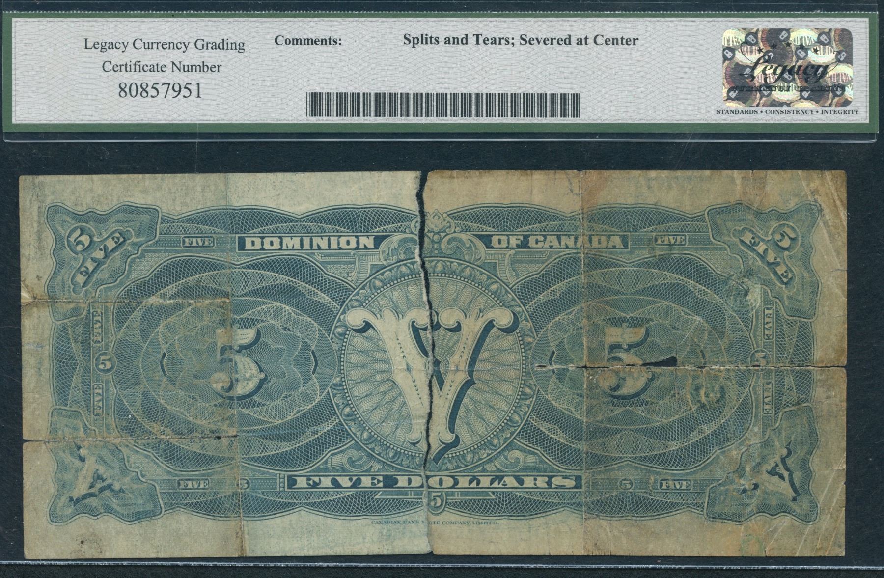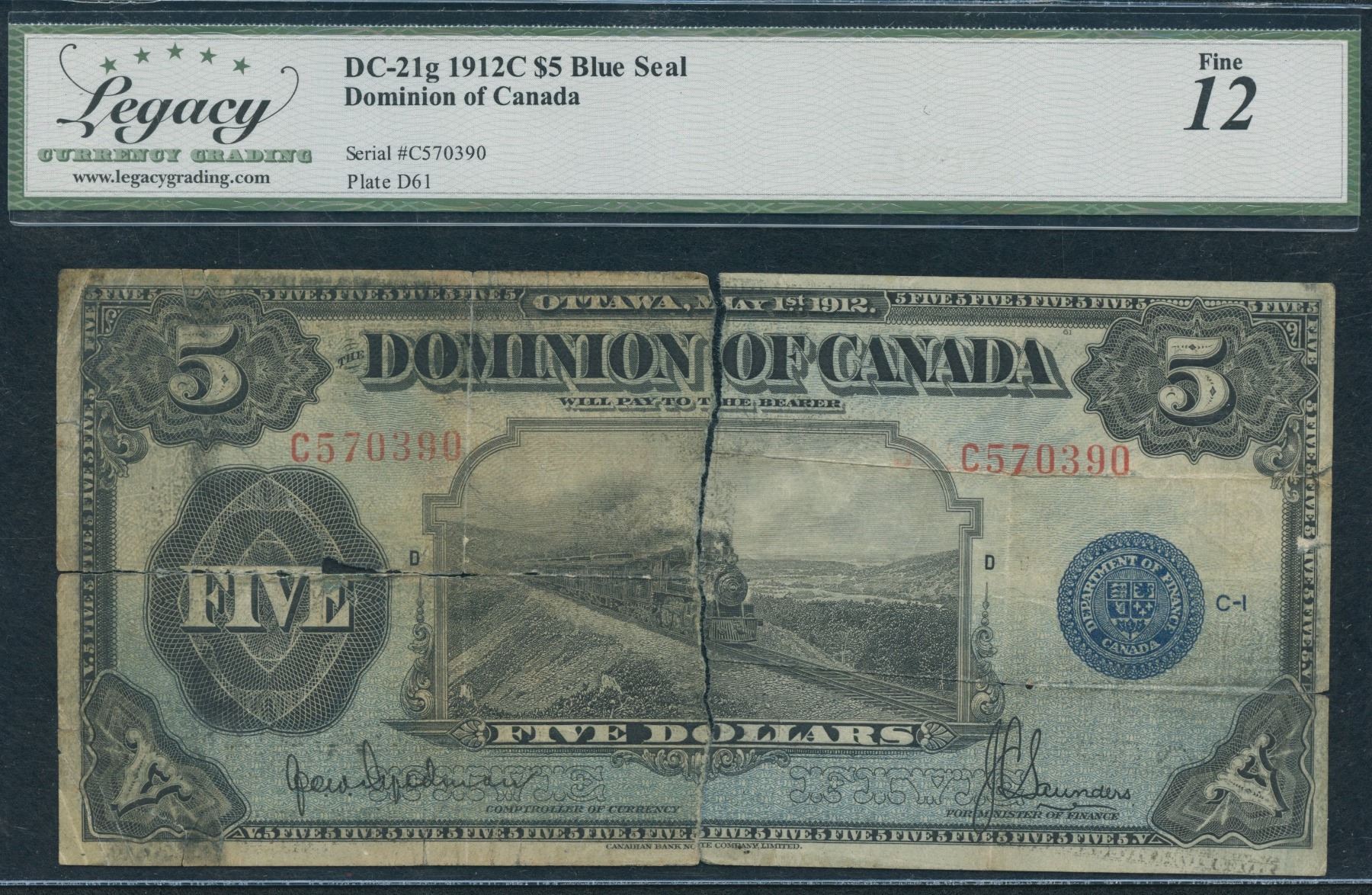 DC-21g. Legacy Fine 12, annotation, severed at center. This note holds a love story. In early 1918, a young man has headed off to war leaving the love of his life behind. To show a token of their love, the couple took a 1912 $5 banknote and tore it in half, leaving each person as a symbol of their love, and with the promise that one day the two halves will come together and be whole once again. We are pleased to offer this happy ending note, whole once again. C Series, S/N:C570390.