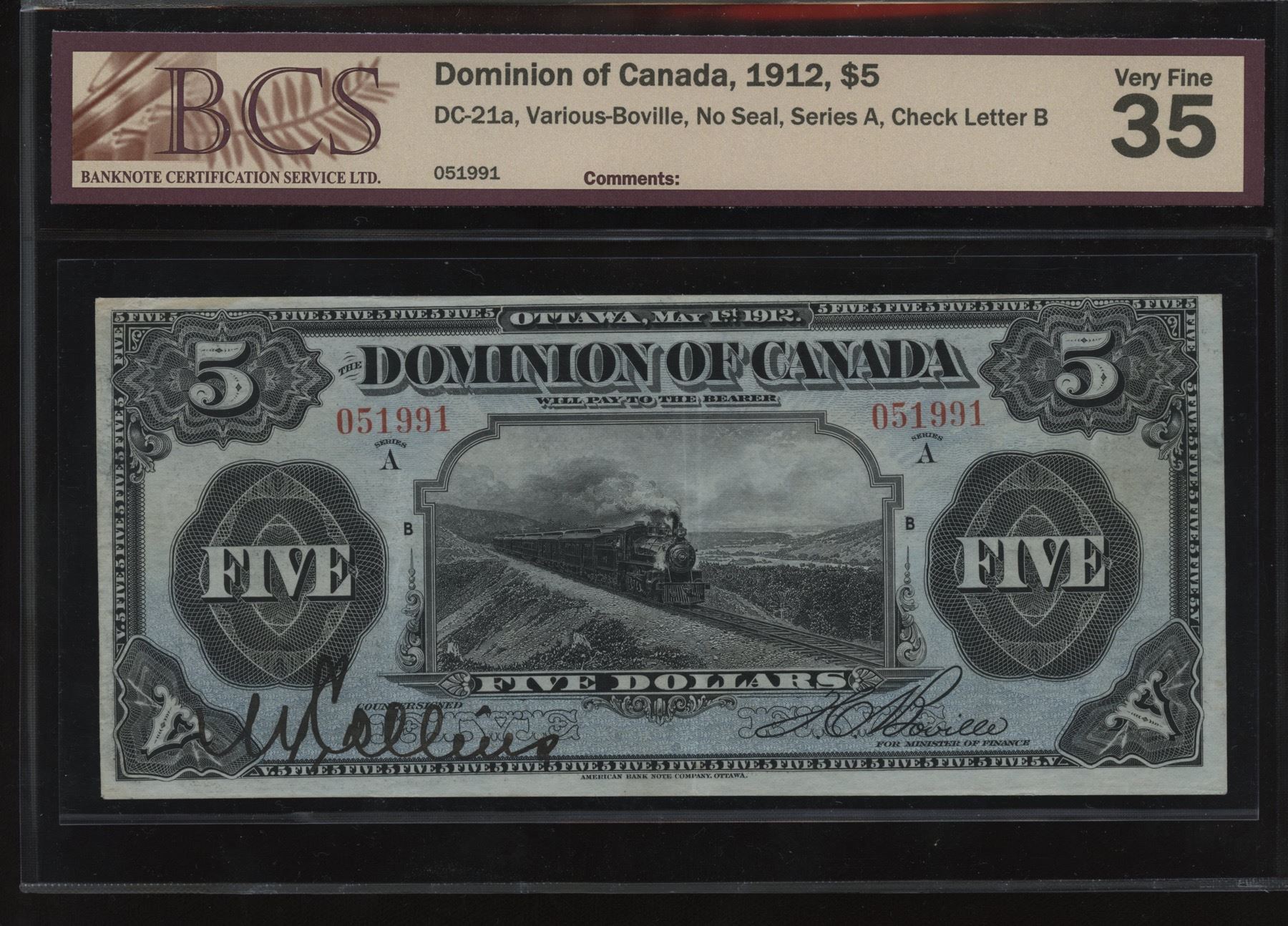 DC-21a. BCS VF35. Bold signatures with great colour. Nice run of Canada's most recognizable notes. S/N:051991/B.