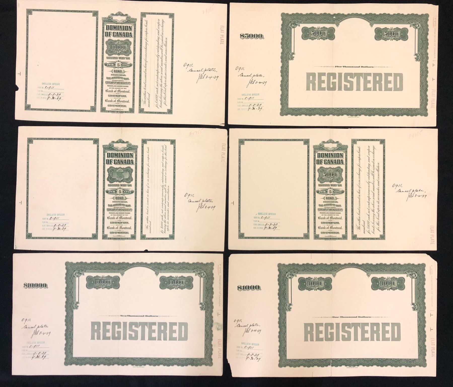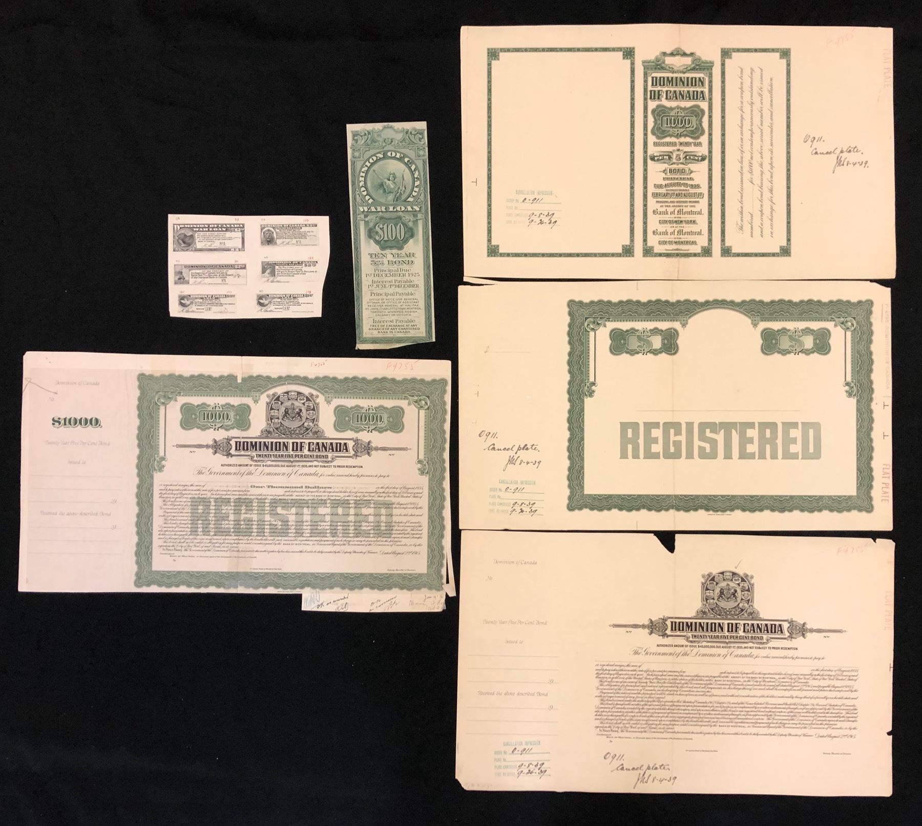Dominion of Canada Bonds, probably 1915 issue, cancellation proofs in green (one in black), printed in 1939 directly on card, various denominations, faces and backs, 9 items, some beginning to separate at ends of folds. Also a 1915 $1000 bond, approval face proof, mounted on card. Lot also includes a piece cut out of a 1915 $100 War Loan bond, and finally, six different bond coupon proofs mounted on one card, all bearing engraved T. C. Boville signature.