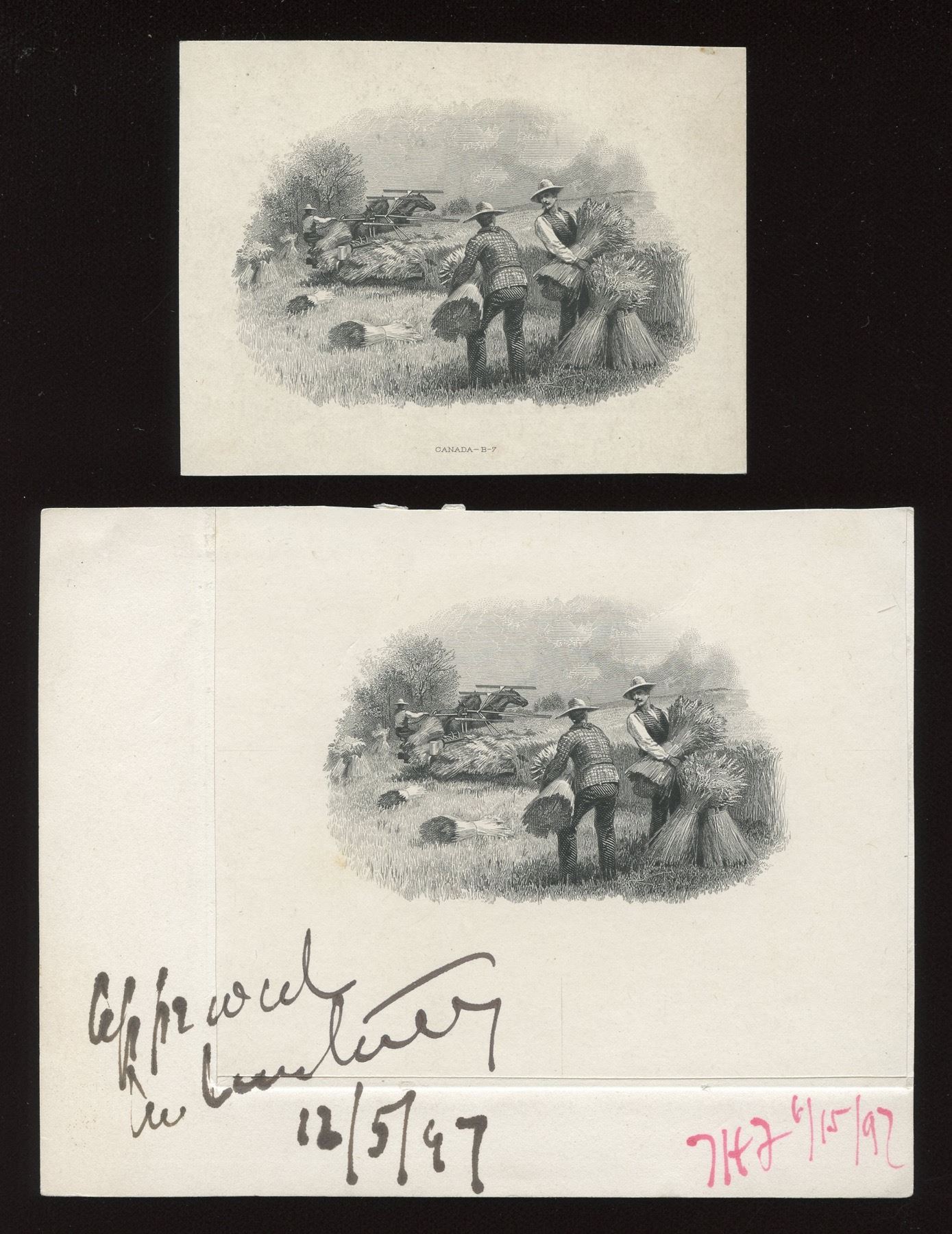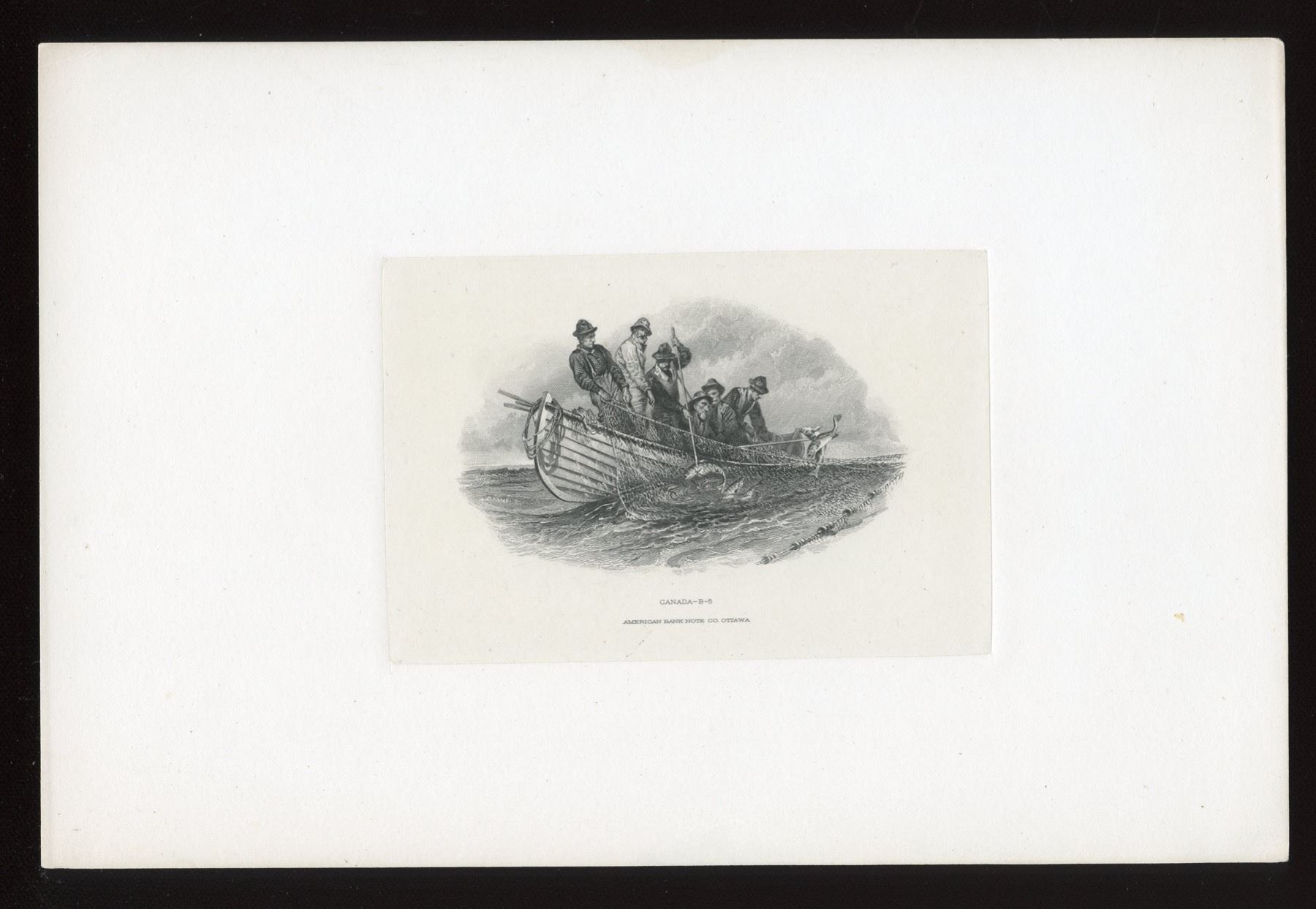 Dominion of Canada, DC-14 1897 $2, complete set of die proof vignettes. Prince of Wales and fishermen on full cards, back vignette cut down, with an extra approval proof hand signed by J. M. Courtney, 12/5/97. Four die proof vignettes, a good start on a fine exhibit.