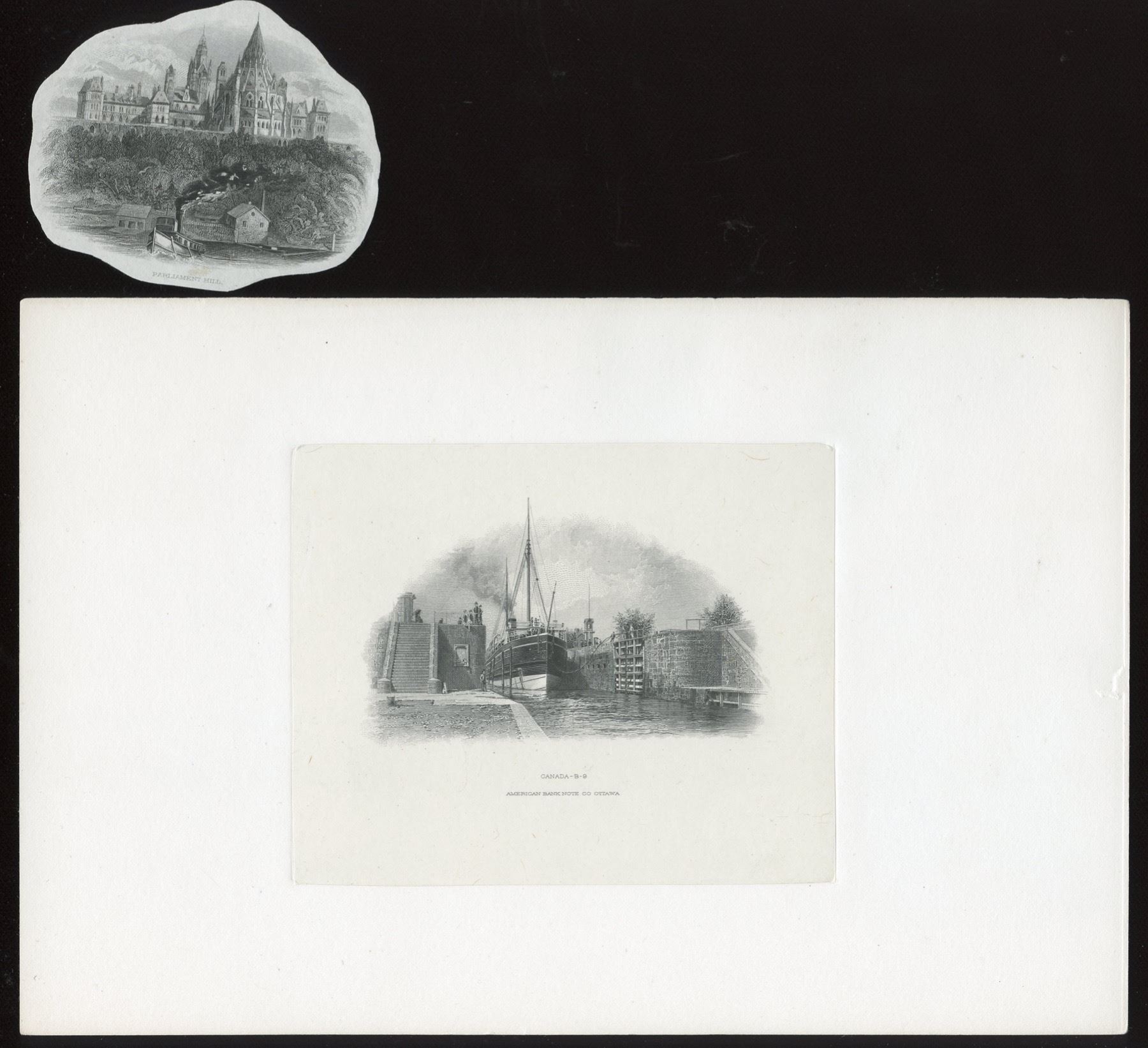 Dominion of Canada, DC-16. Die proof vignette: Sault Ste. Marie lock on the 1900 $4 note, Canada B-9 on full card. Lot includes a vignette of the Parliament Buildings somewhat like that on the back of the $4s, cut down.