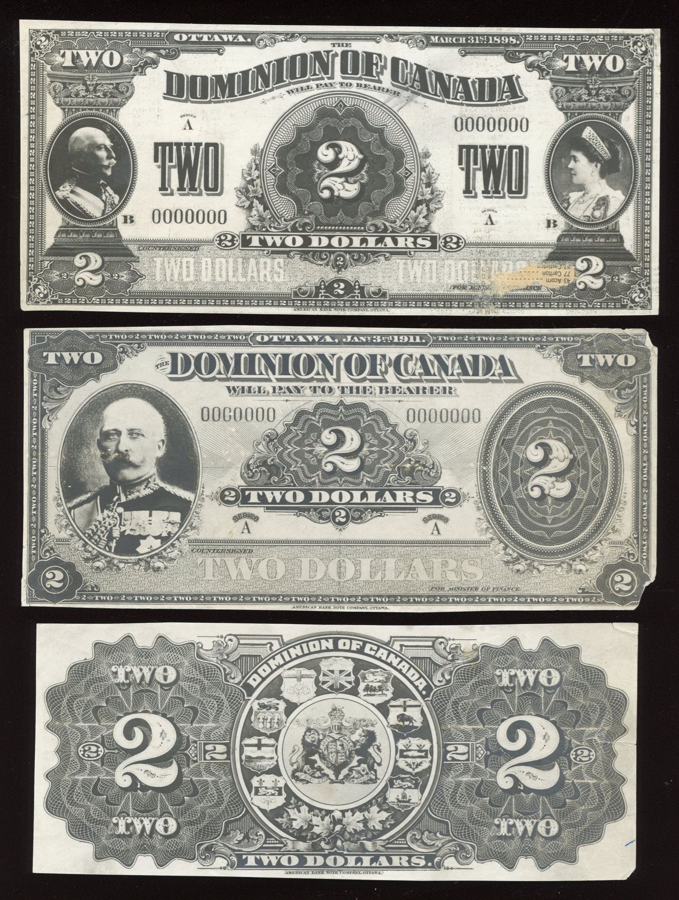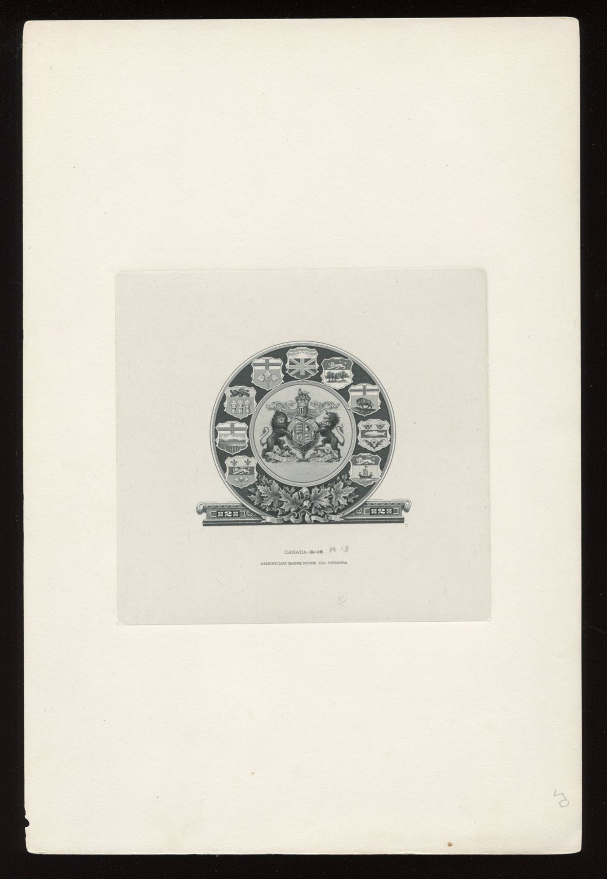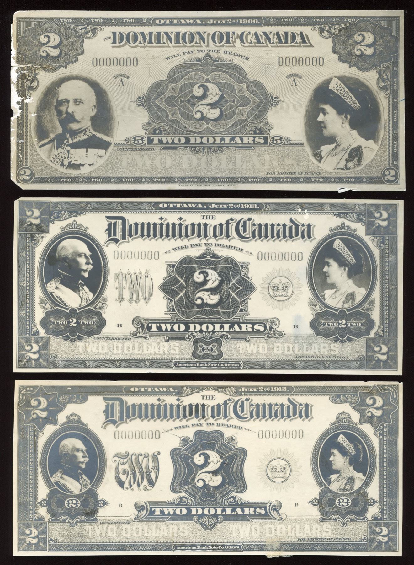 Dominion of Canada, DC-22. A treasure trove of design history: six photos of models for this issue, five different faces and one back, all apparently unpublished heretofore, from the Walter Allan collection. All the preceding have light to moderate defects. Likely unique and a solid basis for a specialist's collection of the Connaught issue. Also, a die proof vignette Canada B-12 (crossed out, B-13 pencilled in) on full card, fairly similar to 1914 $2 back vignette but bearing a much closer resemblance to the vignette on the back model photograph in this lot.