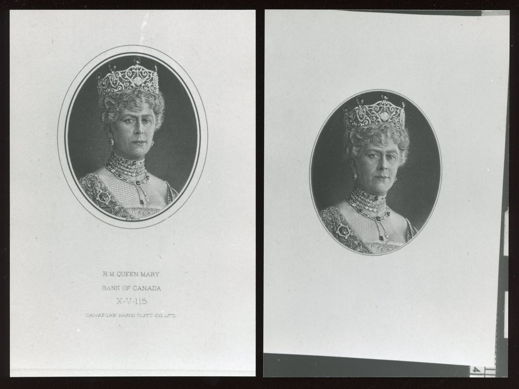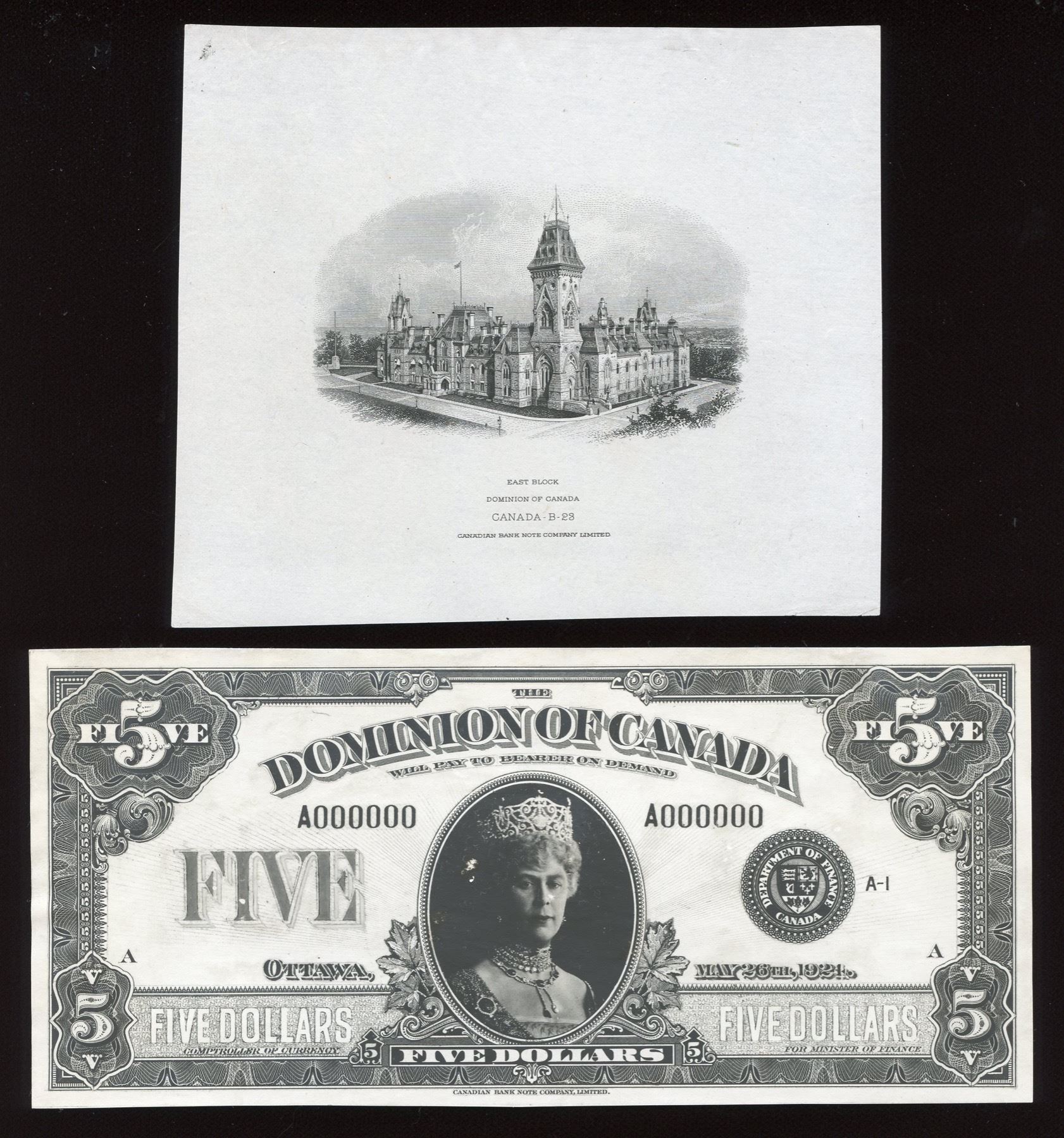 Dominion of Canada, 1924 $5 group: Back die proof vignette, "East Block", Canada B-23, on India paper. Real photo of Queen Mary by VanDyck, London, not used. Photograph, apparently of a model. Two enlarged photos of die proof vignettes showing same portrait of Queen Mary as on 1924 $5, but prepared for Bank of Canada, X-V-115, one with imprint etc. and one without. Total of five items.