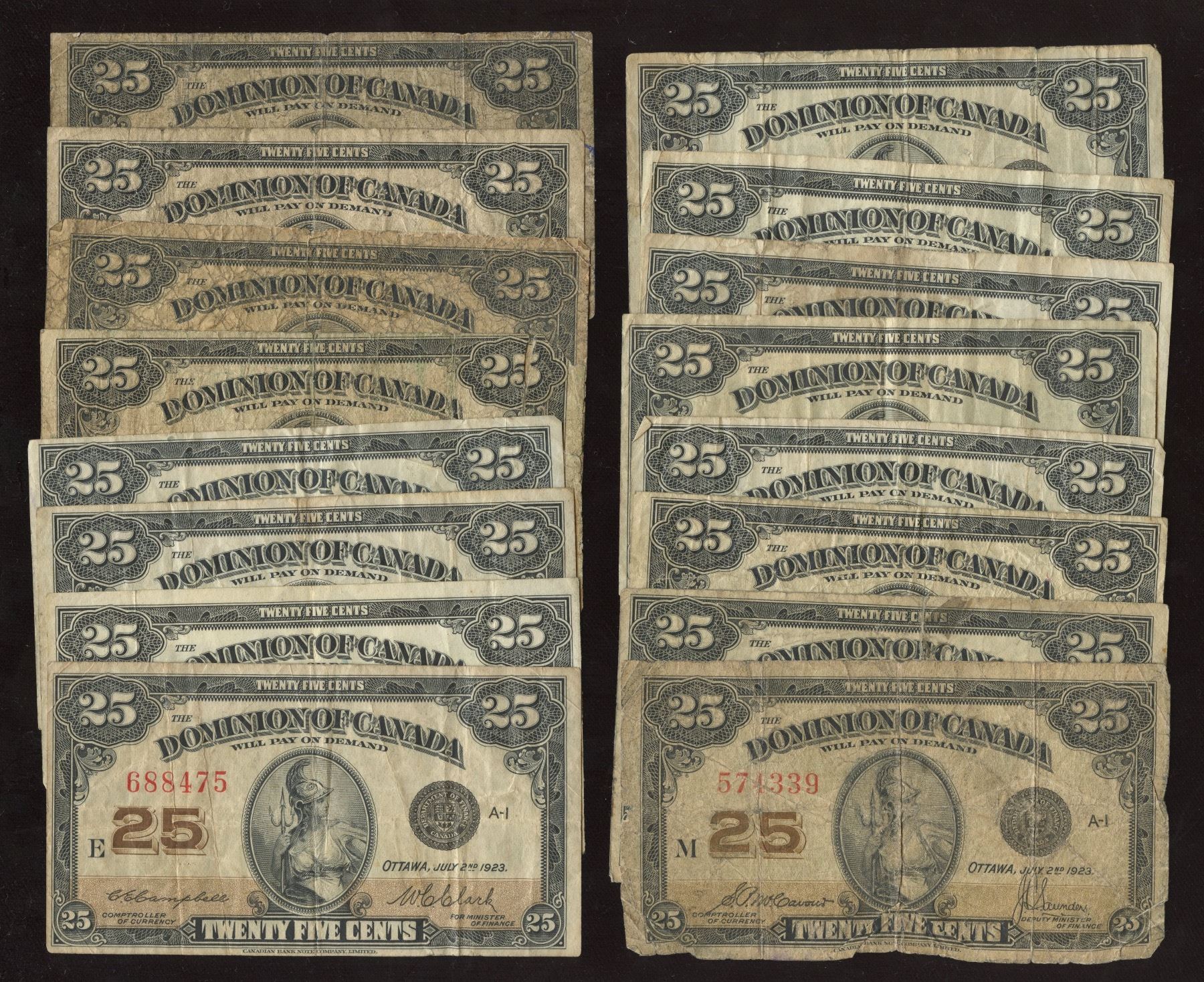 DC-24, a collection of 16 Dominion of Canada 1923 25 cents notes. Various lower-mid grades