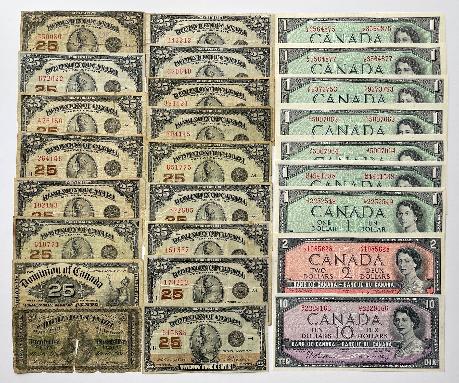 Dealer Lot of 17 Dominion notes, average conditions & 1954 Bank of Canada material. Nice lot worth inspection. 26 pcs.
