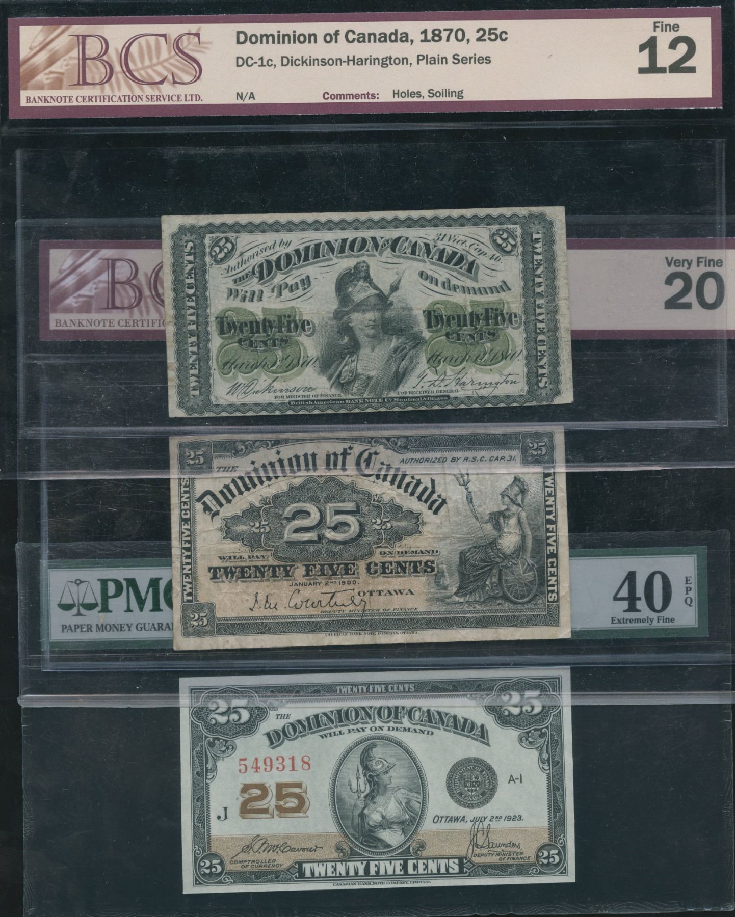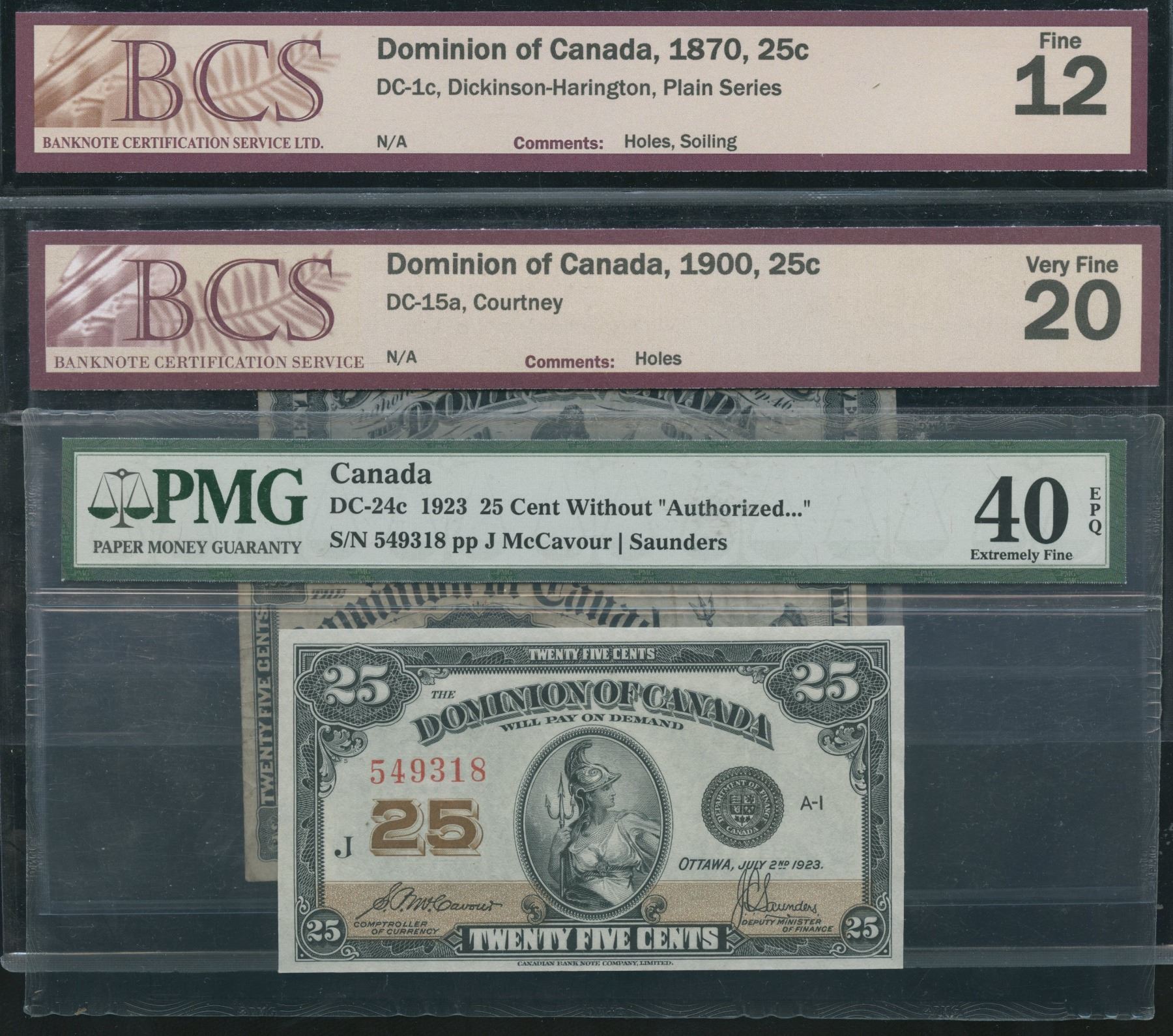 Includes: 1870, DC-1c, Plain Series, BCS Fine 12. 1900, DC-15a, BCS Very Fine 20, holes. 1923, DC-24c, PMG EF40EPQ, S/N:549318/J. 3 pcs.