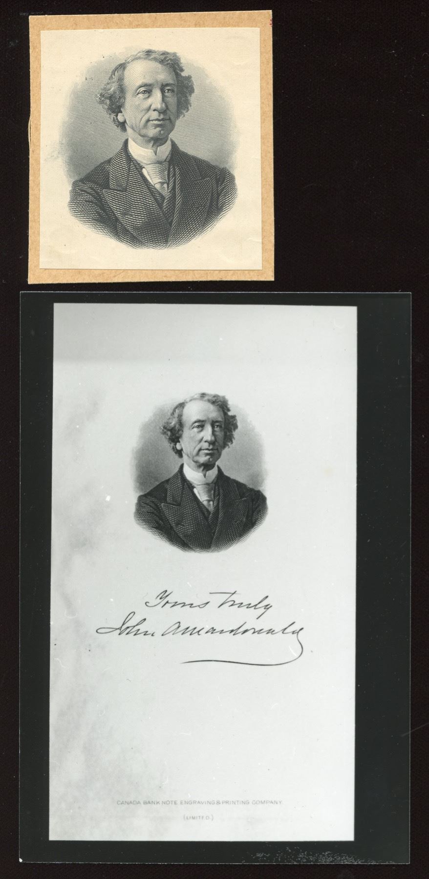 Dominion of Canada, die proof vignette, Sir John A. Macdonald, engraved by Canada Bank Note Co. and used on 1886 $2 Essaie (first published in Jan. 1978 CPMS Journal, page 5, and now in National Currency Collection). Similar to portrait on DC-30, 1896 $5,000 Bank Legal. The Macdonald portrait, slightly enlarged, is found on the Bank of Canada 1971 and 1989 $10s. Lot also includes photograph of the frontispiece of vol. 4 of The Scot in British North America by W. J. Rattray, an early use of the vignette.