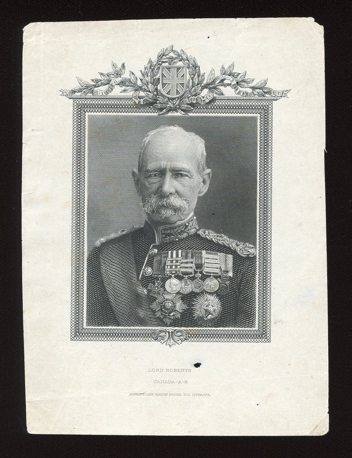 Dominion of Canada, die proof vignette, Lord Roberts, Canada A-8, as seen on 1901 $1,000 and 1924 $1,000 Bank Legals, holes. A rare opportunity to obtain an important bank legal component.