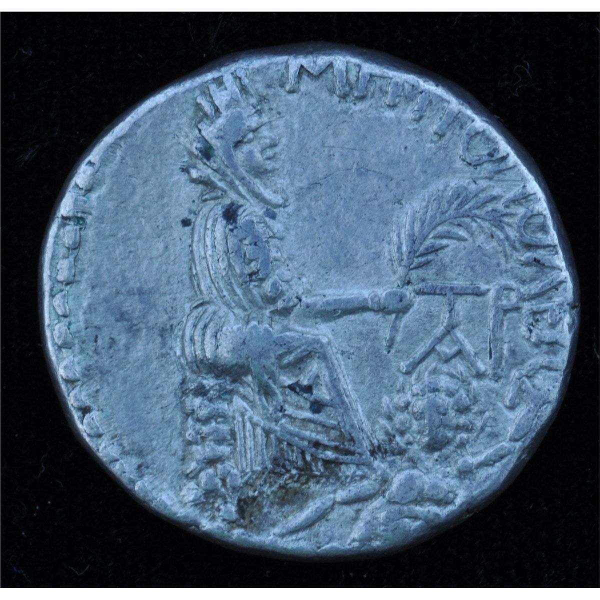 Domitian (81-96 AD) - AR -Tetradrachm Tarsus Obv: Laur. hd. r. Rev: Tyche of Tarsus seated right on rock, holding palm; river-god Cydnus swimming right below; monogram in right field. RPC II 1727; Prieur 750; AEF, great portrait.