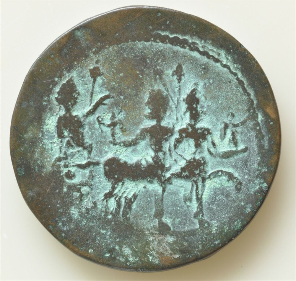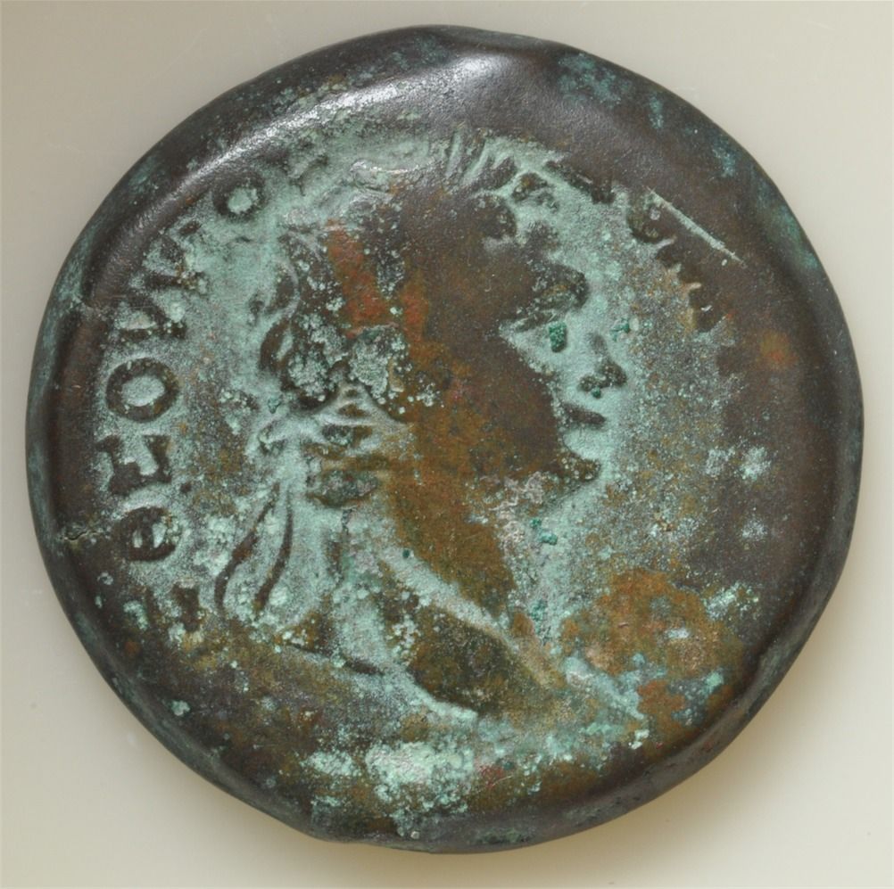 Domitian (81-96 AD) - Egypt AE-35 Hemidrachm Year 14 (94-95 AD) Obv: Laur. hd. r. Rev: Domitian in biga of Centaurs r. holding branch and septre. 26.2 grams. S-2848. Ex:Virgina Ruzika Coll. Malter Dec 8, 1984; Ex:Kerry Wetterstrom Coll CAN XIII 1990. Fine.