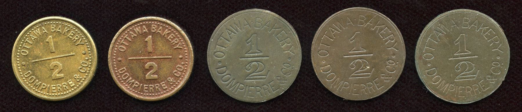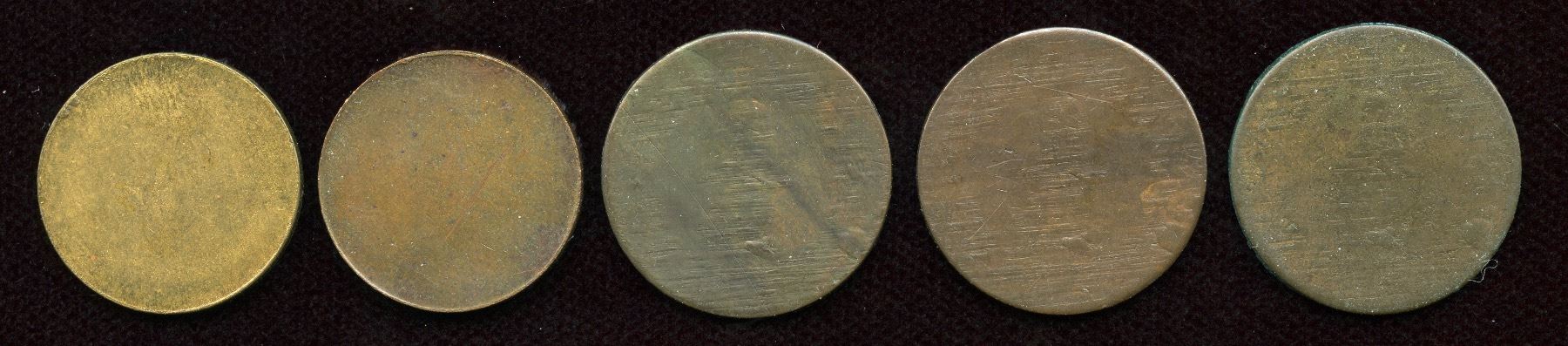 Br. 740, Astwood 1205h, 1/2 Loaf, Brass, EF; Br. 740, Astwood 1205i, 1/2 Loaf, Copper, EF; Br. 738B incused, Astwood 1205n, 1/2 Loaf, copper, EF; two more tokens same as previous. 5 Pcs.