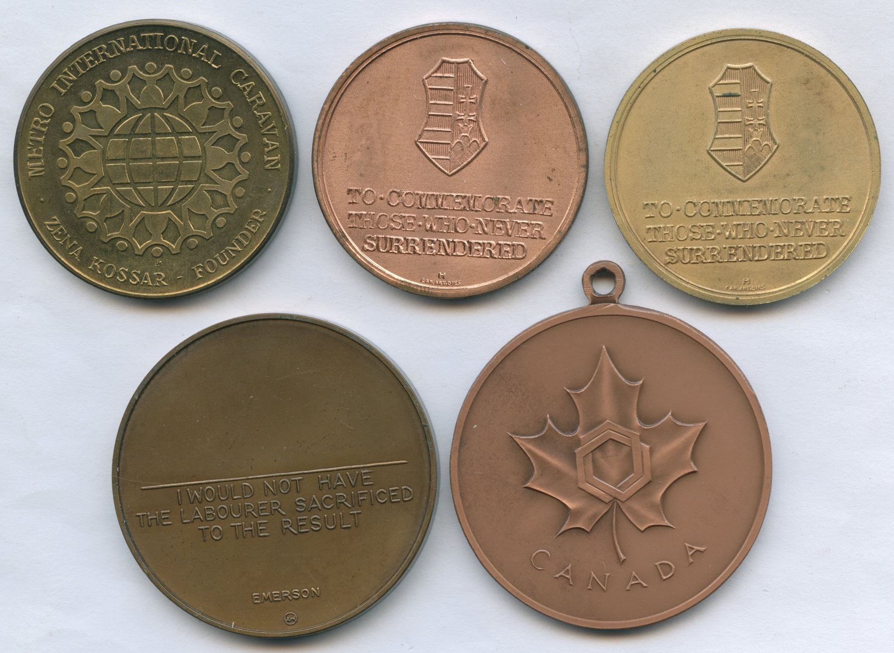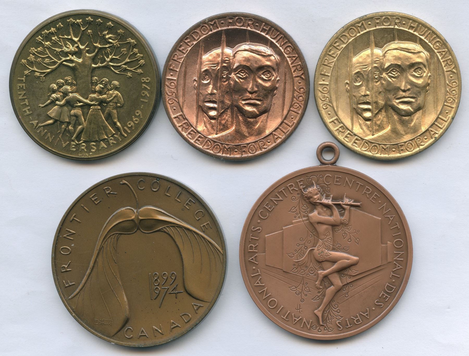 Includes: 75th anniversary of Frontier College, The maple key depicts the College's educational initiative throughout Canada since 1899 bz, 44mm. 1956-1966 Freedom for Hungary , brass & copper. Metro International Caravan, 1978, br, 38mm. National Arts Centre, AE, 45mm. 5 pcs.