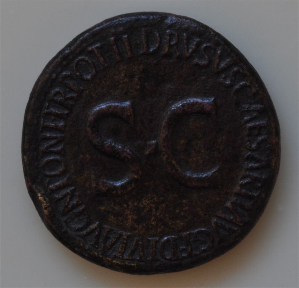 Drusus Under Tiberius (23 AD) - AE-Sestertius Rome Obv: Caduceus between crossed cornucopiae, each surmounted by a bust of the twin sons of Drusus, Tiberius Gemellus and Germanicus. Rev: Large S C DRVSVS CAESAR TI AVG F DIVI AVG N PONT TR POT II. 25.6 grams S-1793. Rim bump at 8:00 o’clock on the reverse. Glossy dark brown patina. Good VF.