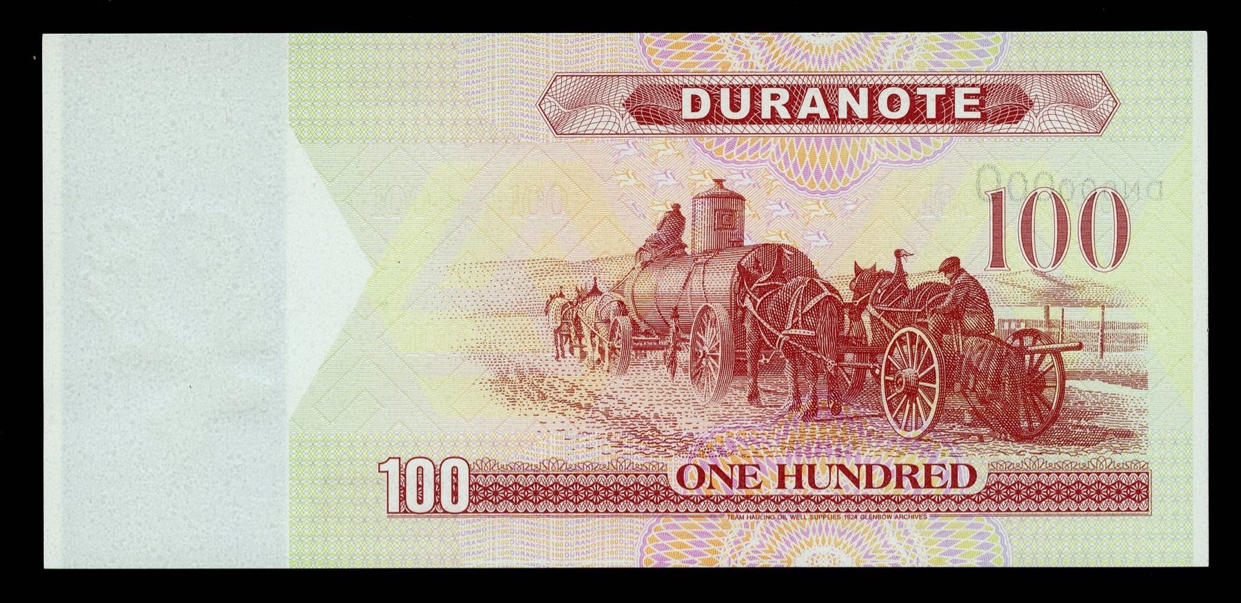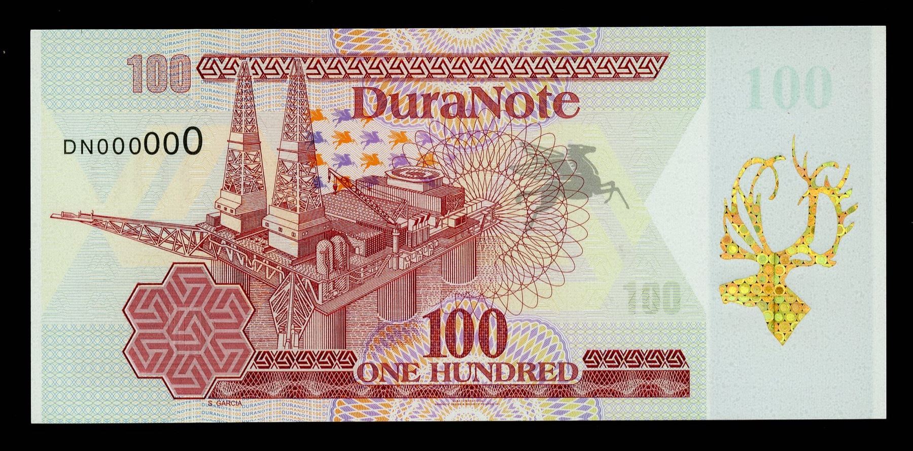Maple Leaf Window. Was a product of Mobil Chemical and AGRA Vadeko of Canada. Trials of DuraNote were not successful and the project was abandoned. Patents for DuraNote were sold following the Exxon-Mobil merger. Several DuraNote advertising notes were produced by Silba International, Banknote Design & Security Printing, Inc. Today these sometimes appear on the collectors’ market. DuraNote offered advanced counterfeit protection through being constructed of 21 ultra-thin layers of OPP film, adhesive, coatings and printable surfaces. Contemporary promotional material claimed it lasted four times longer than conventional rag paper-printed notes. It stayed crisp and did not dirty easily. These properties translated into reduced printing costs. In addition the manufacturers proposed that each note would have a clear plastic window which, along with a choice of embedded security features, would make notes difficult to copy. DuraNote was an innovative synthetic bank note with the capability of embedding anti-counterfeiting devices between its substrates Test notes were printed for 21 countries using the regular bank note printing plates for each of the countries concerned. Among them was the United States, which produced some 40,000 sheets of DuraNote currency. These have never escaped the Bureau of Engraving and Printing. Presumably they have been destroyed or are buried deep in the bureau’s archive. Since 1999 DuraNote is concentrating on improved laminated substrates, just as the Canadian Domtar is researching with financing from the Canadian Government. This note has the gold hologram caribou.