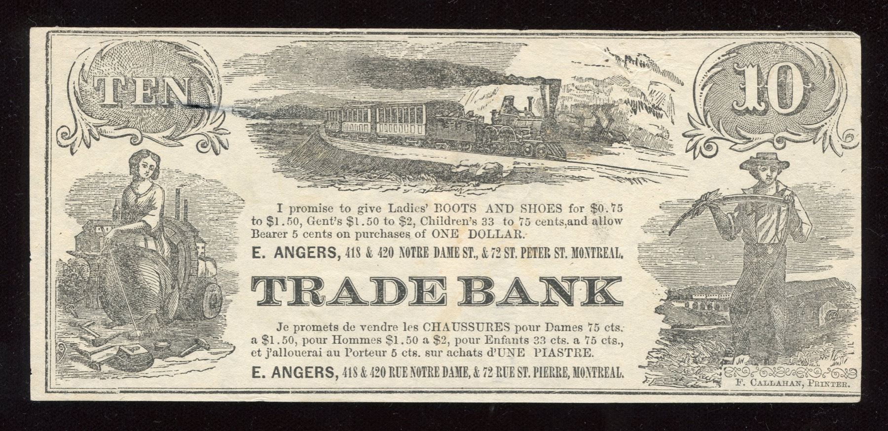 I promise to give Ladies’ BOOTS AND SHOES for $0.75 to $150, Gent’s $1.50-$2, Children’s 33 to 75 cents, and allow Bearer 5 cents on purchases of ONE DOLLAR. E. ANGERS, 418 & 420 NORTE DAME ST., 75 ST. PETER St. MONTREAL. TRADE BANK. Je Promets de vendre les CHAUSSURES pour Dames 75 cts. a $1.50, pour Hommes $1.50 a $2, pour Enfants 33 cts. a 75 cts., et j’allouerai au Porteur 5 cts. sur achats d’UNE PIASTRE. E. ANGERS, 418 & 420 NORTE DAME ST., 75 ST. PETER St. MONTREAL. Glue on back and internal tear, otherwise a decent VF.