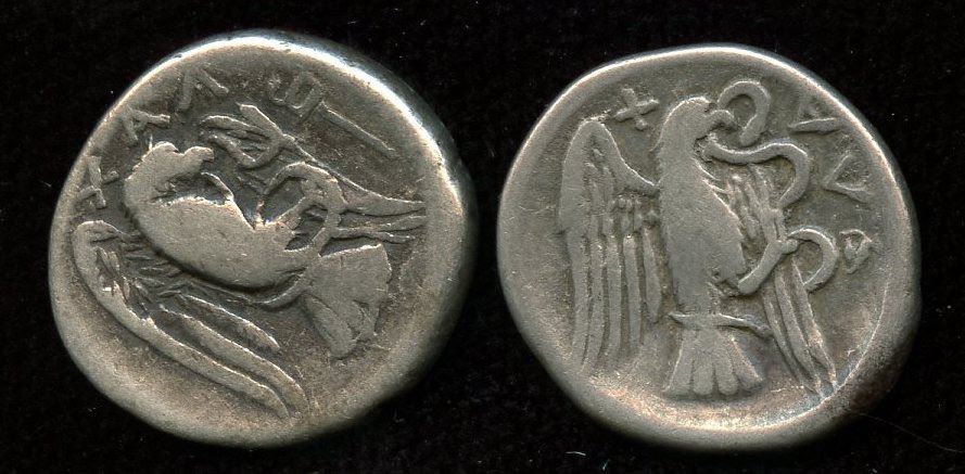 Head of Hera right. Rev: Eagle flying right, carrying a snake. Sear-2482 - (3.56g) gF, (3.63g) aVF/gF. 2 Pcs