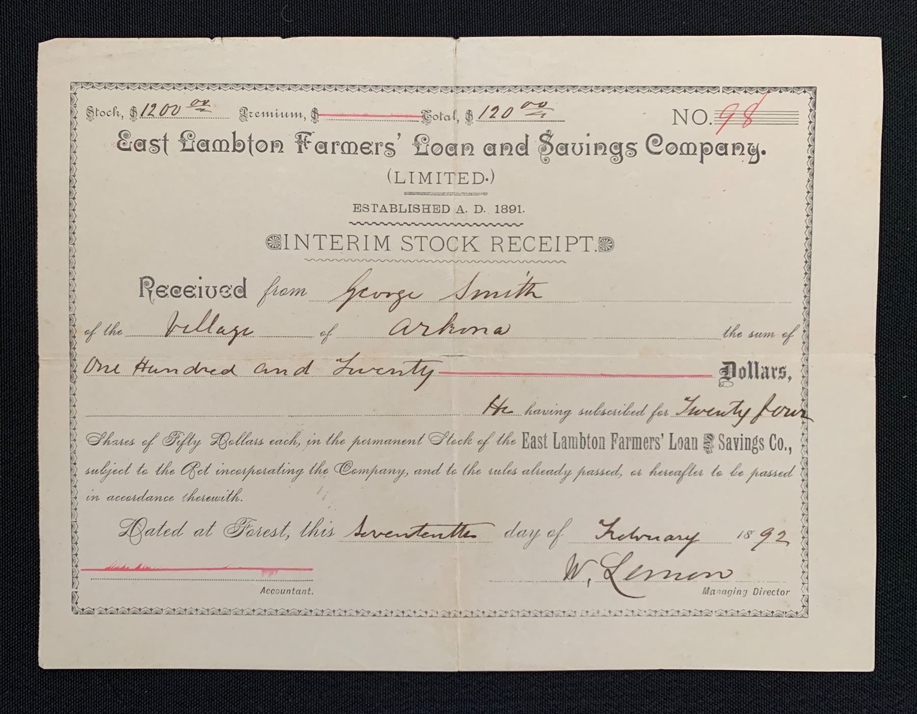 Forest, Ontario. Interim Stock Receipt for payment of 10% instalment on twenty-four $50 shares, 17 Feb. 1892, to George Smith of Arkona, signed by W. Lemon, Managing Director. VF.