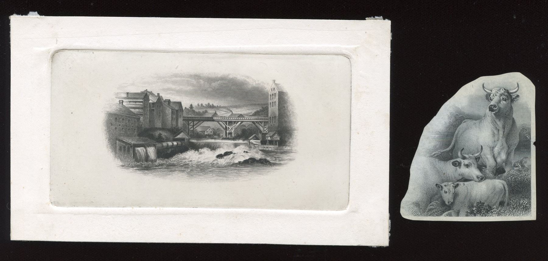 Eastern Townships Bank, die proof vignettes: Prince of Wales on full card, Sherbrooke Mills, Wild Cattle of Chillingham, this last cut out. Total of three vignettes.