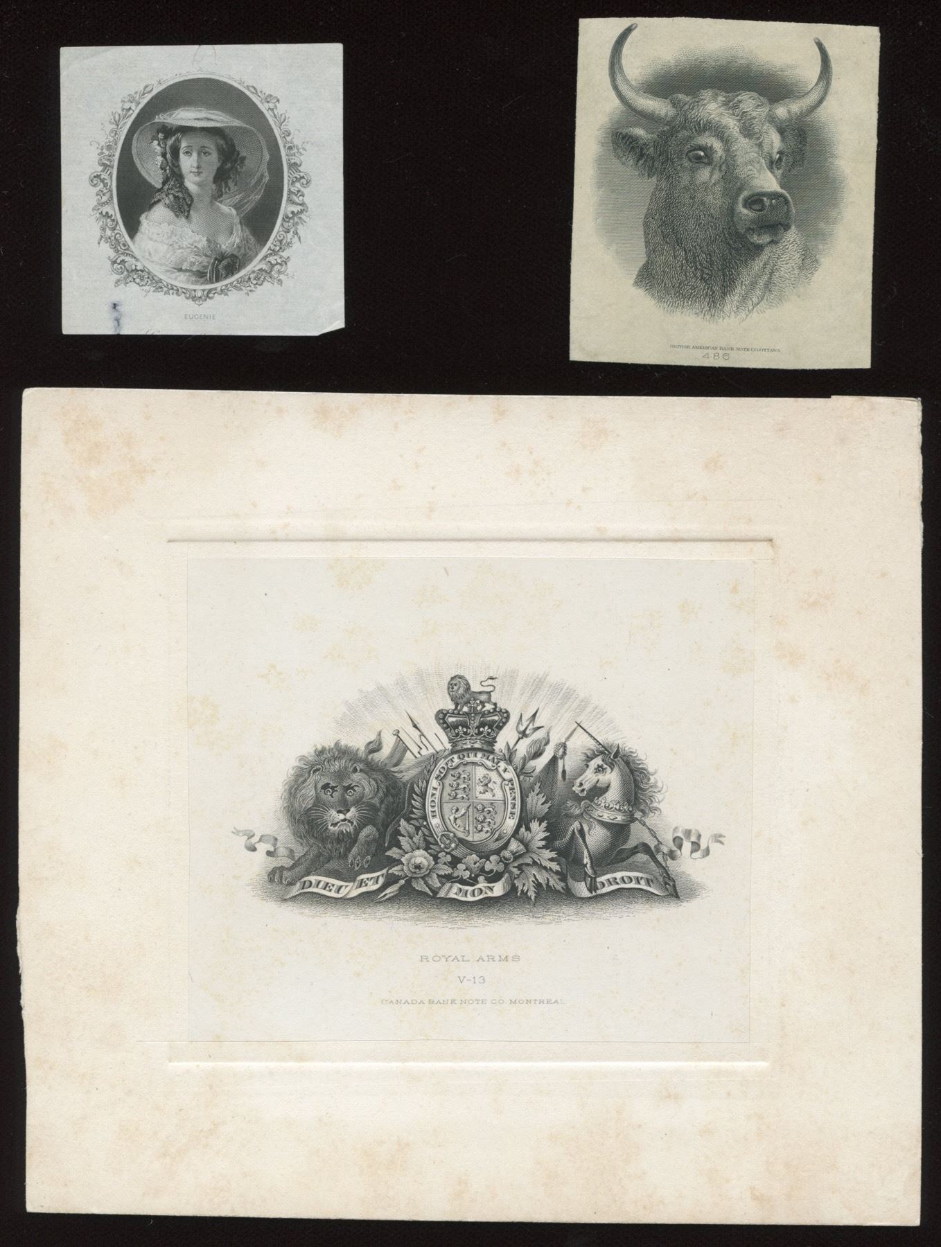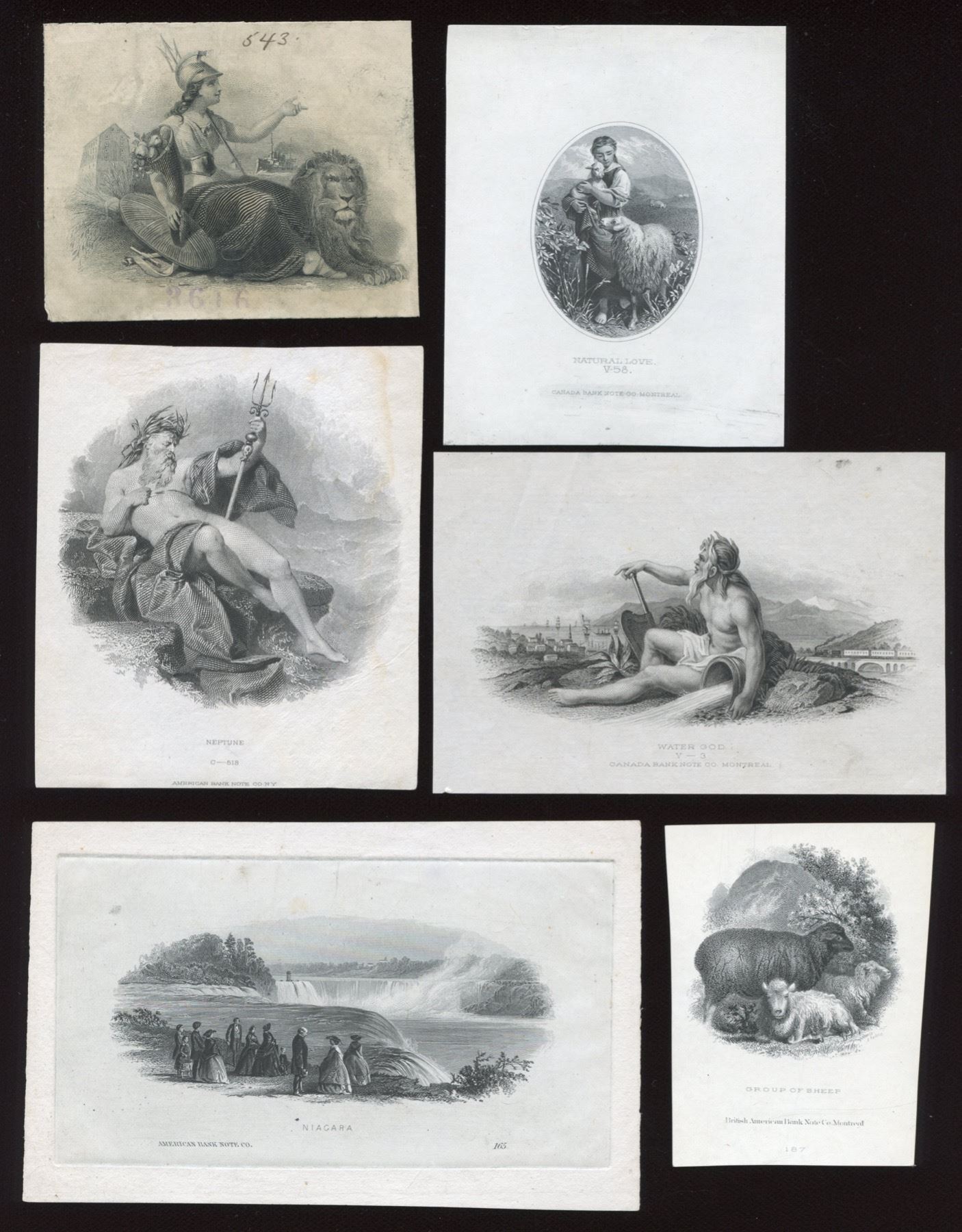 "Royal Arms", Canada B.N. #V-13; "Natural Love", Canada BN #V58; "Steer's Head", BABN #486; "Niagara", ABN #165; "Eugenie", thin spot; "Neptune", ABN C-158; "Water God", Canada B.N. #V-3; seated Britannia and lion. Nine Vignettes.
