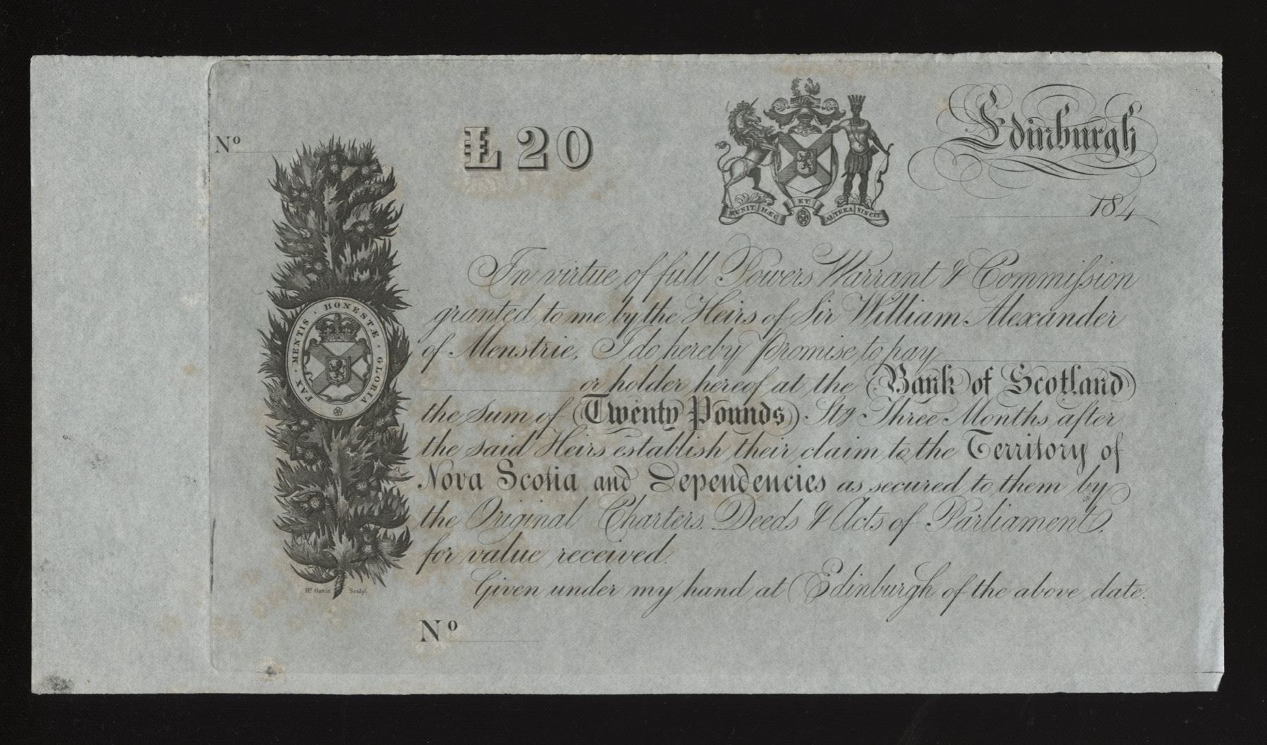 Under powers granted by heirs of Sir William Alexander of Menstrie, to be paid three months after said heirs established their claim to Nova Scotia and Dependencies! (King James I granted the plantation of Nova Scotia to Alexander in 1621. The territory was returned to France in 1632 and Alexander, the 1st Earl of Stirling, died broke in 1640.) Not issued; has a couple of pin holes, and some age staining as most of these do. One very similar example but torn sold for US $280 plus commission in Archives International Sale, 13 Mar. 2018 (see lot 54 on icollector). 2 Pcs.