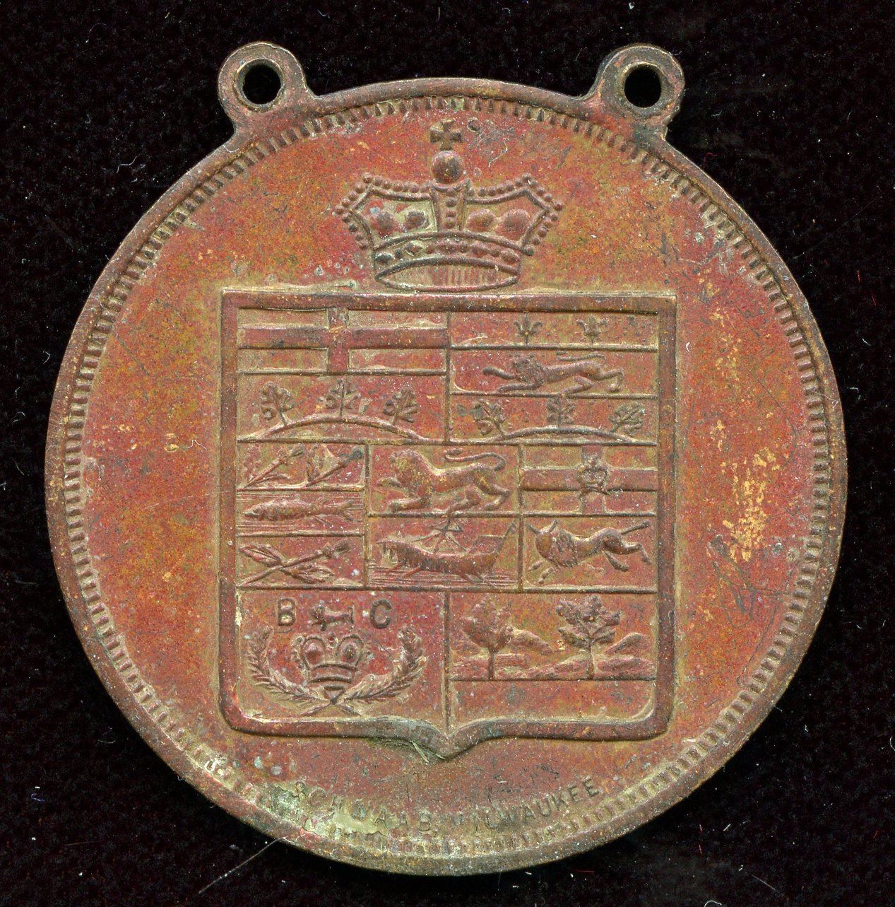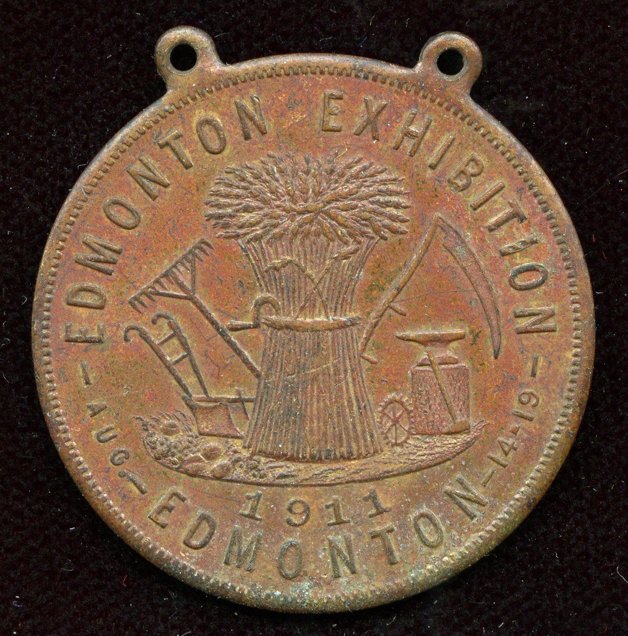 Obv Edmonton Exhibition\Edmonton, Rev Dominion Crest, copper with 2 loops at top, unlisted in Charlton.