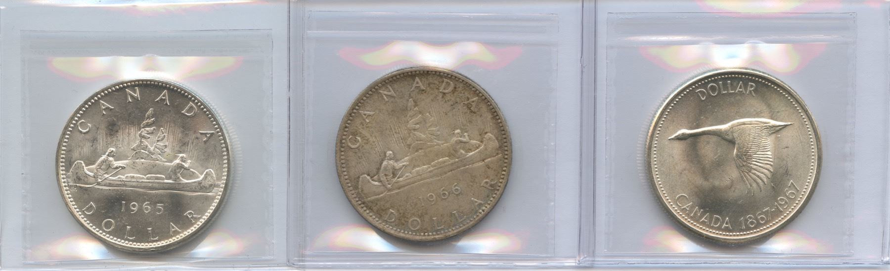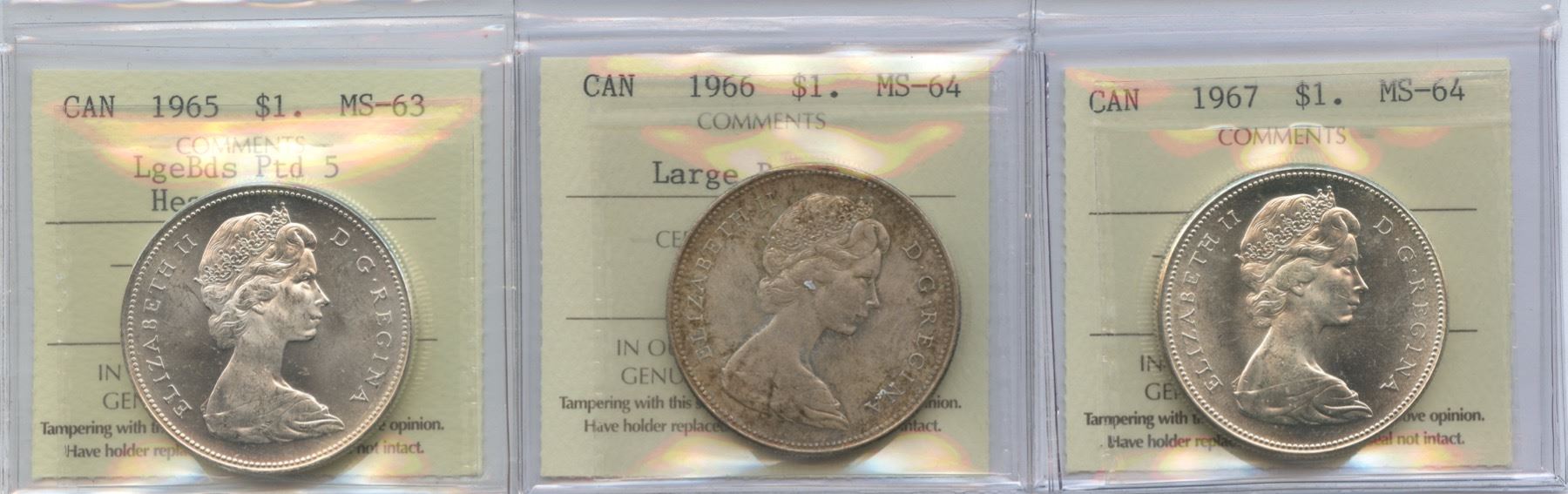 1965 ICCS MS-63, LgeBds Ptd 5, Heavy Cameo; 1966 ICCS MS-64, Large Beads; 1967 ICCS MS-64. 3 Pcs.