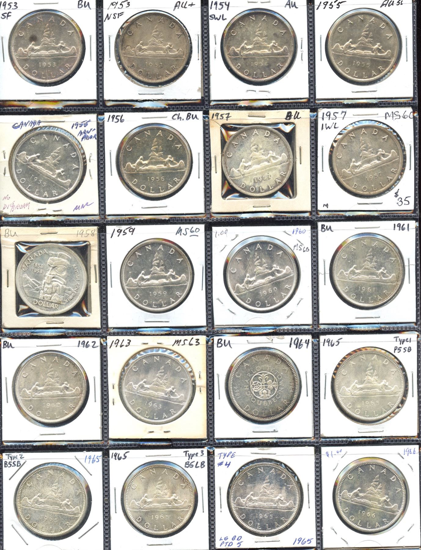 Elizabeth II silver dollar collection: 1953 to 1966, 20 coins and includes varieties such as 1954 SWL, 1955 Arnprior (w/o die break), 1957 1WL, 1965 (Types 1 to 4). Grades range from nice AU to mint state, most are BU. 20 Pcs.