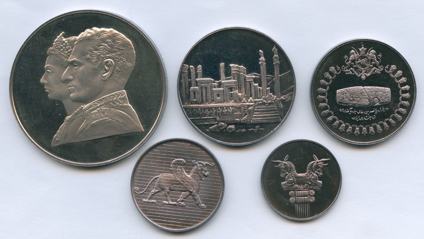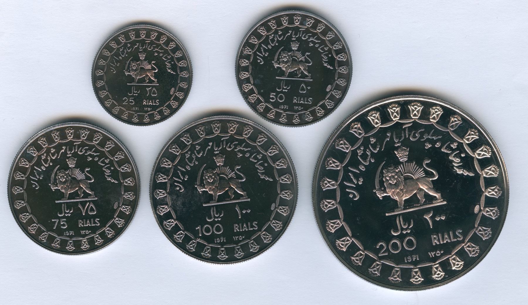 Commemorating 2500 Years of Iranian Monarchy. 5 coins included 200 Rials 60 grams, 100 Rials 30 grams, 75 Rials 22.5 grams, 50 Rials 15 grams, 25 Rials 7.5 grams .999 silver. Uncirculated.