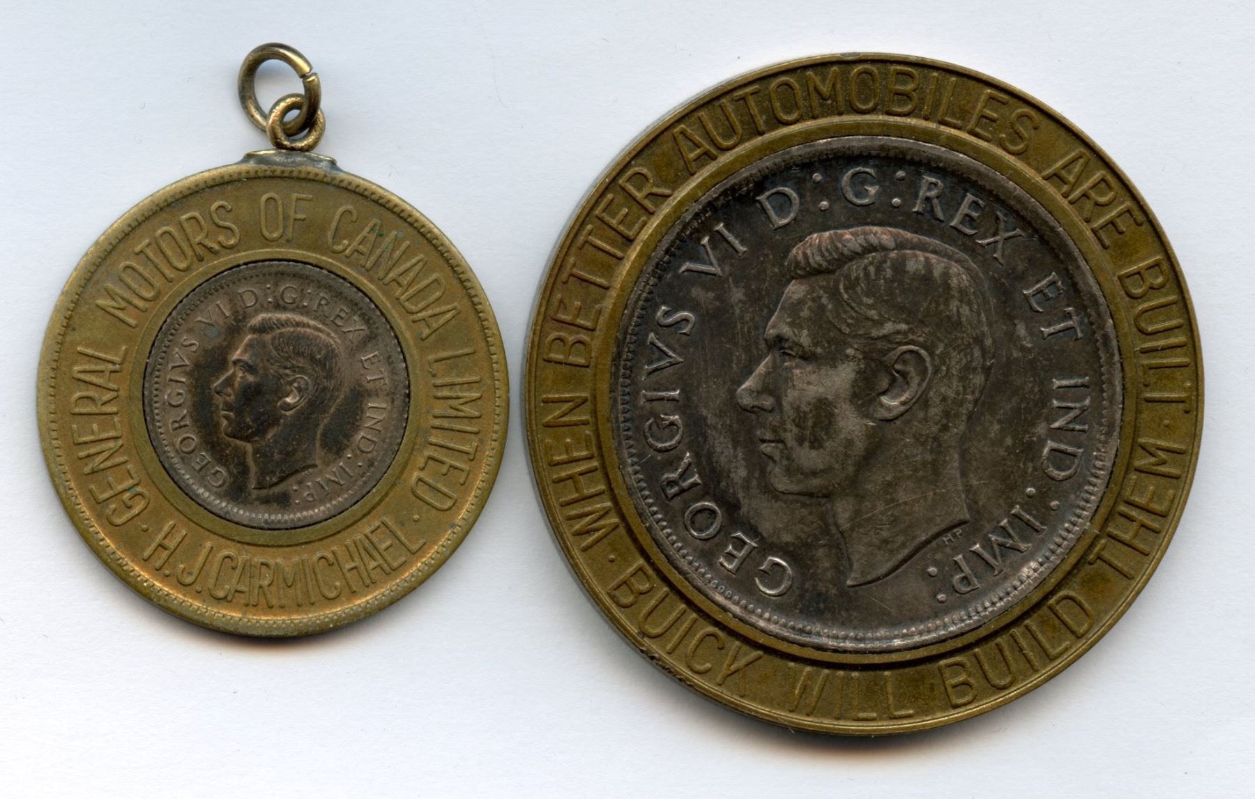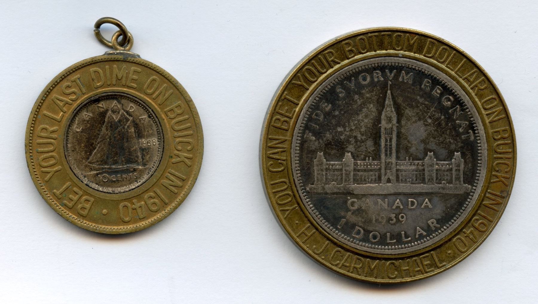Includes: 1938 Ten Cents in General Motors of Canada "Bet your last dime on Buick in 1940" & H.J. Carmichael 1939 Silver Dollar "You can bet your bottom dollar on Buick in 1940. 2 pcs.