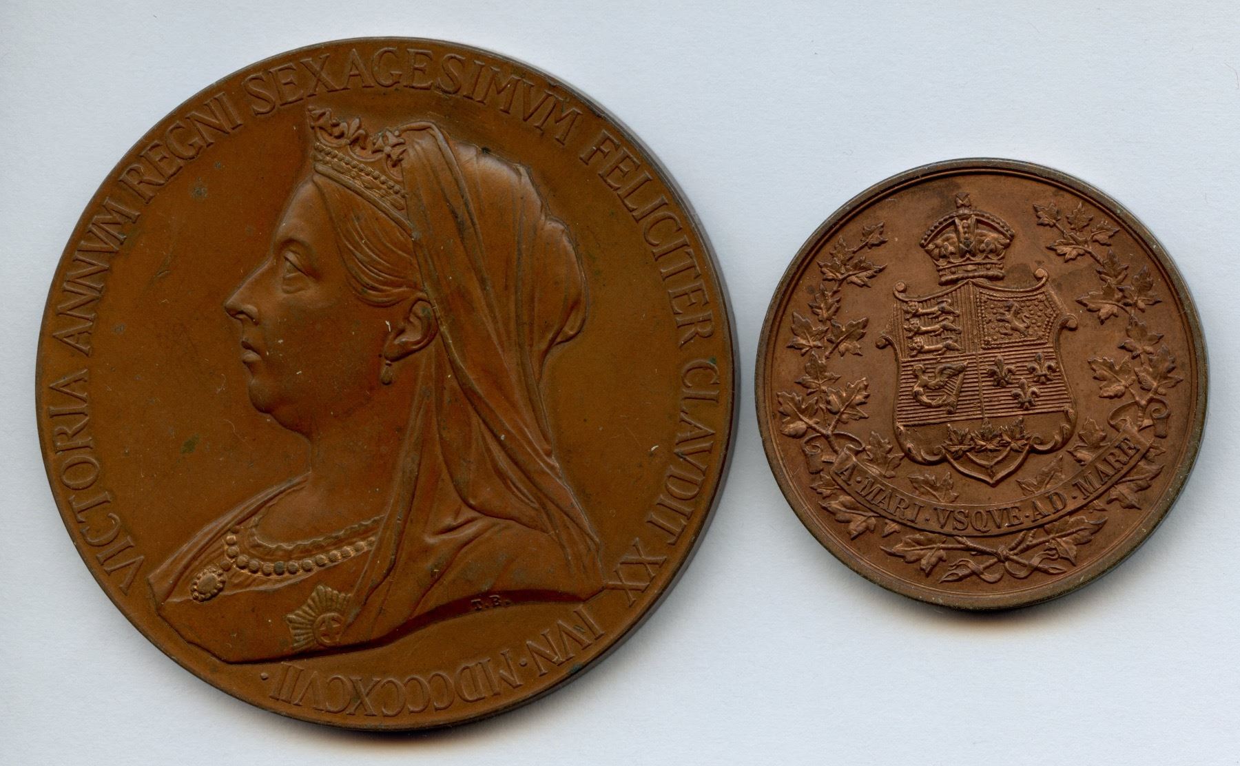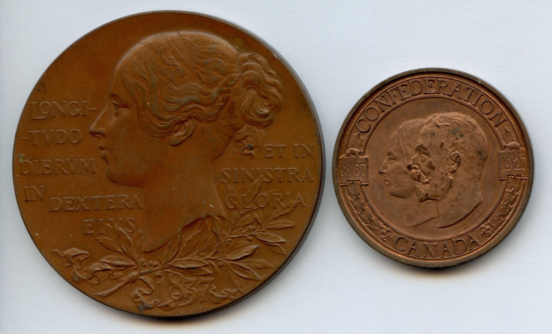 1897 Queen Victoria diamond jubilee bronze medal, 65 mm; 1927 60th anniversary medal of Canadian confederation, bronze, 25 mm (large size). 2 Pcs.