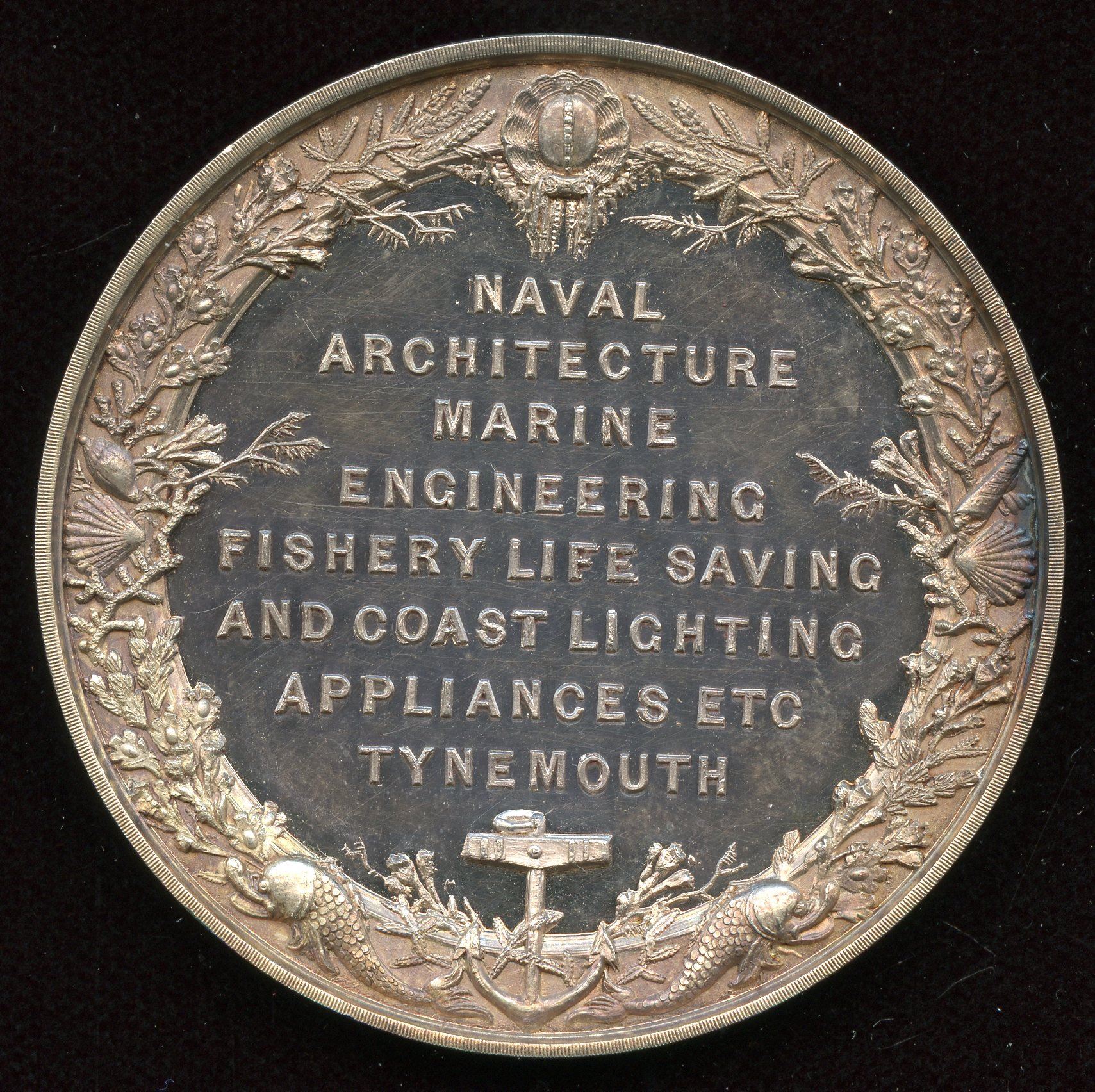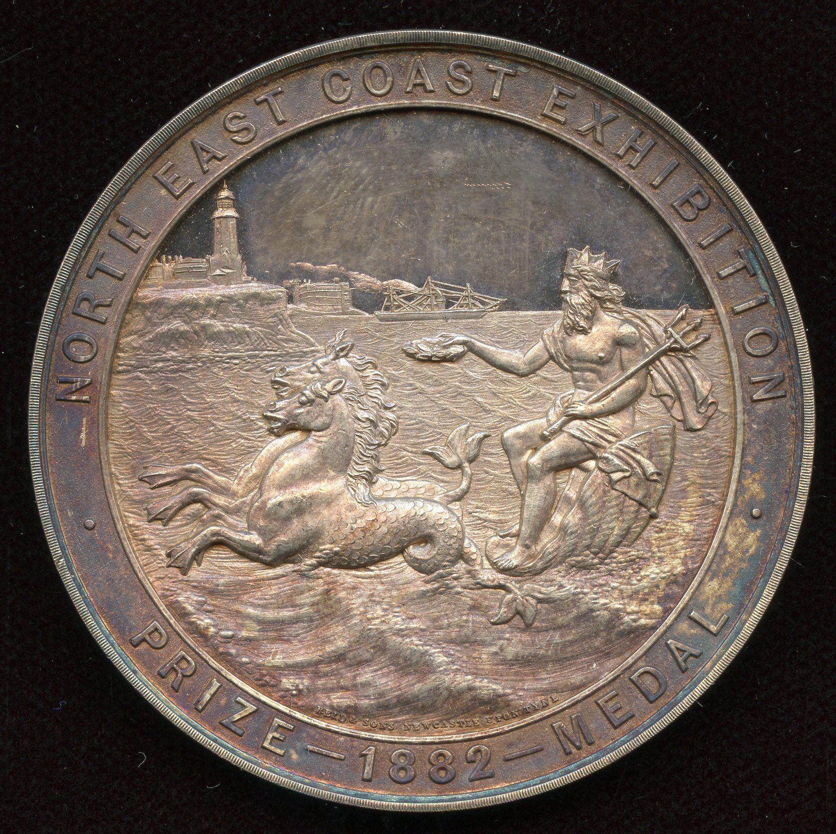Obv " North East Coast Exhibition/ Prize 1882 Medal", Rev "Naval/ Architecture/ Marine/ Engineering/ Fishery Lifesaving/ And Coast Lighting/ Appliances, Etc./ Tynemouth", silver, 51mm, 61.2 gms, UNC in case of issue