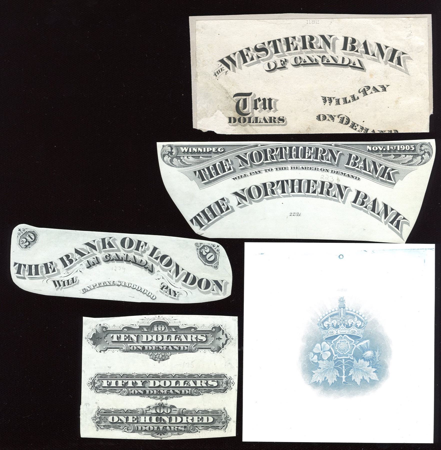 three denominational counters on one piece; Bank of London in Canada; Northern Bank; Western Bank of Canada, all bank names with additional text. Lot includes a die proof vignette in blue of the crown and symbols device used on the backs of all denominations of the Crown Bank of Canada, BABN #469, "Crown Bank Arms", engraved in 1904.