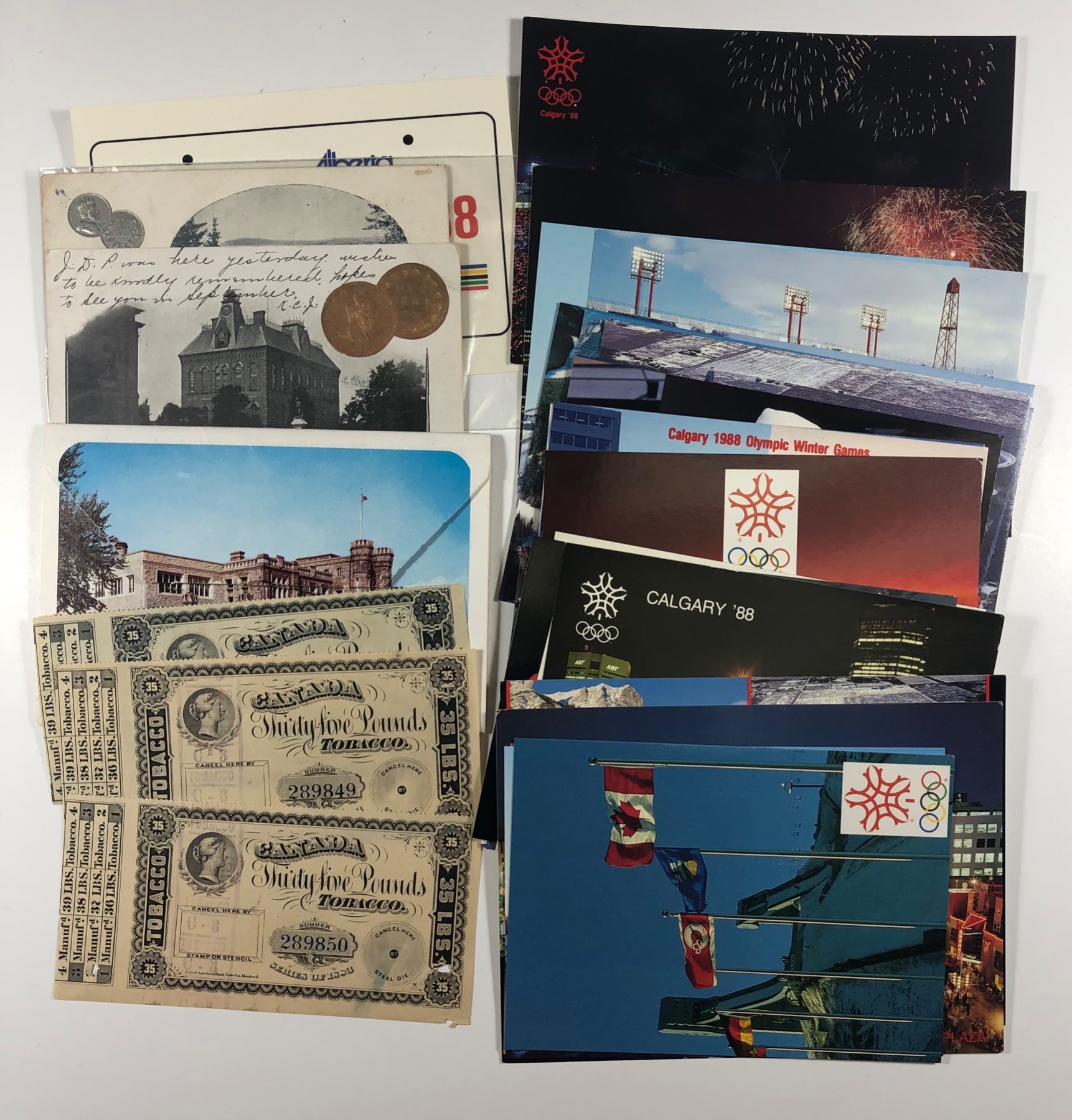 3 Canada Victorian tobacco chits for 35 pounds. Printed by the British American Bank Note Co. in Montreal. 2 coin cards of St. Martins, NB and Charlottetown, PEI. A set of Royal Canadian Mint postcards showing production facilities and finally 28 color postcards of the 1988 Winter Olympics in Calgary, Alberta. 34 Pcs.