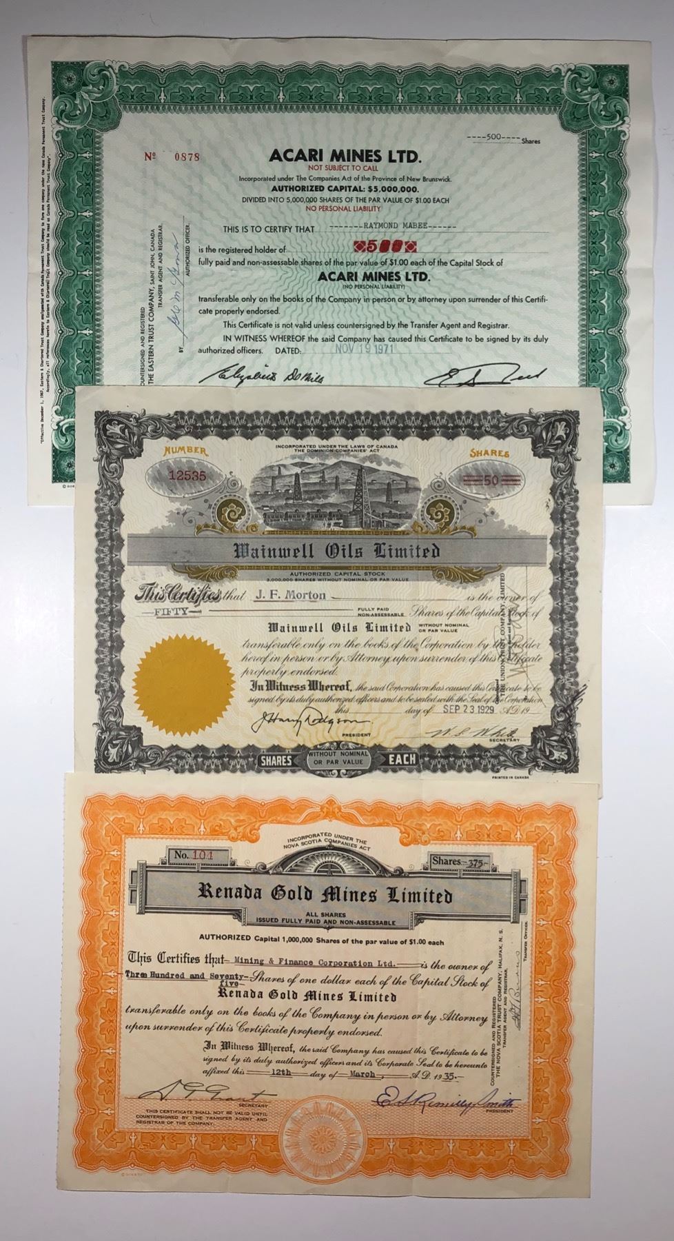 8 share certificates for Renada Gold Mines, Devenish Petroleum Limited, LaHave Outfitting Company Limited, Wainwell Oils Limited and Acari Mines Ltd. 8 Pcs.